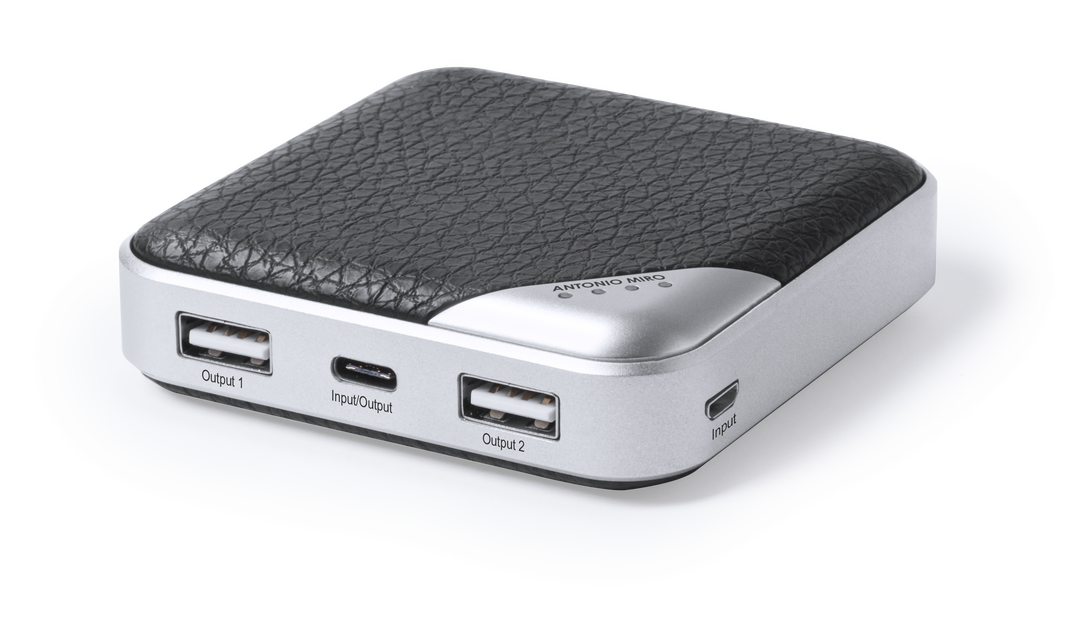 Batería auxiliar externa de Antonio Miró de gran capacidad de carga -5.000 mAh-. Con conexión tipo C de entrada/salida de corriente y salida USB dual, para carga simultánea de hasta 3 dispositivos. Con cuerpo en elegante combinación de materiales piel y m 5000 mAh. 2 Salidas USB y 1 Tipo C. Entradas Micro USB y Tipo C. Cable No Incluido