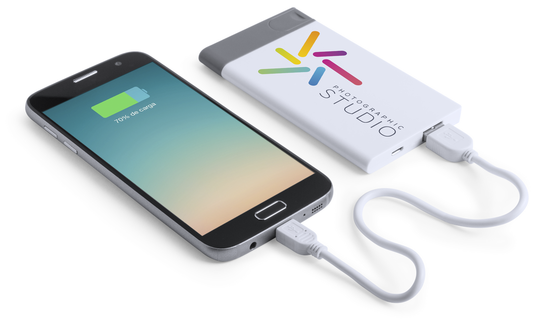 Batería auxiliar externa ultraplana de 2.500 mAh de capacidad de carga con memoria USB extraíble de 8 GB de capacidad y cable micro USB incluido. Amplia superficie de marcaje, especialmente recomendada para tampografía y marcaje digital, todo ello present 2500 mAh. 1 Salida USB. Entrada Micro USB. 8GB. Cable Incluido