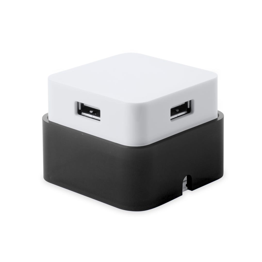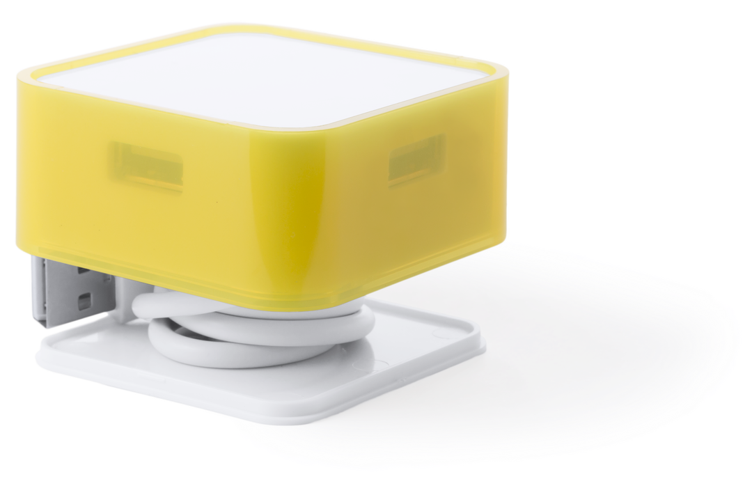 Original puerto USB 2.0 en divertido diseño bicolor y con mecanismo plegable interior para recoger el cable de conexión. Con 4 puertos USB y zona lisa superior para marcaje en tampografía. 4 Puertos. USB 2.0