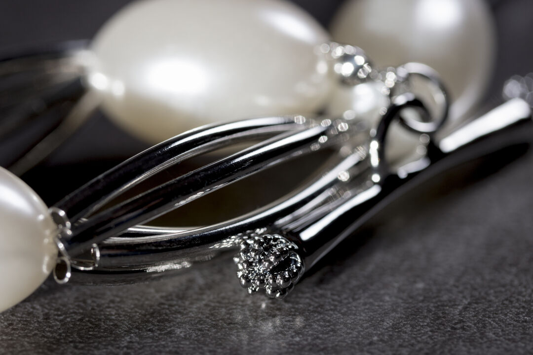 Pulsera de Antonio Miró metal lacado con perlas sintéticas en color blanco y original sistema de cierre. Presentada en funda de polipiel con logotipo de la marca.