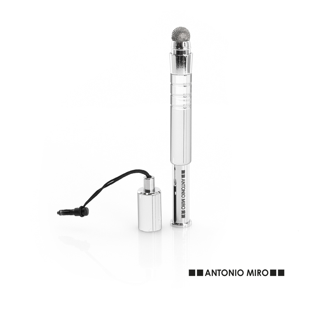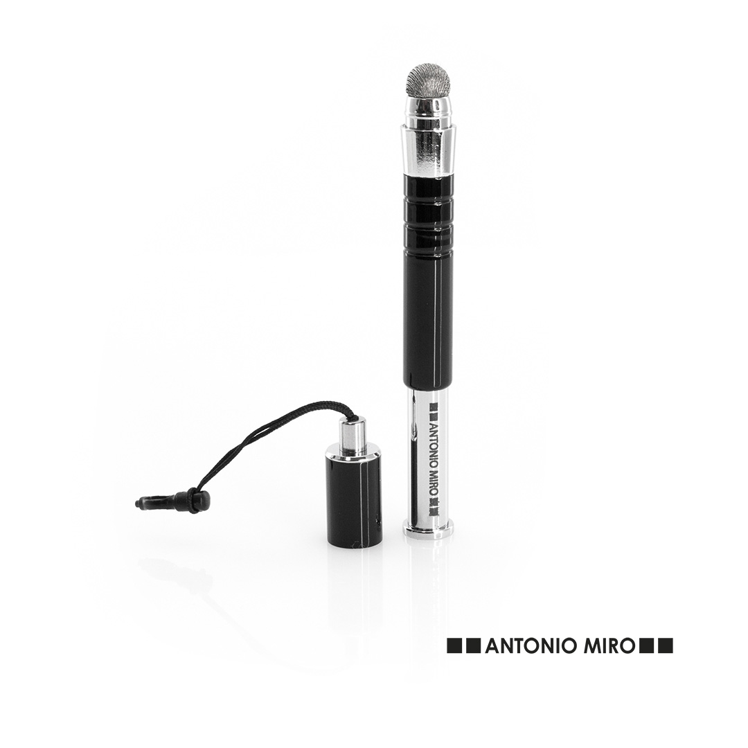 Puntero extensible de Antonio Miró con fibra conductora y cuerpo de acabado metálico en sobrios colores. Con accesorio de ajuste a conexión jack de 3,5mm y con capucha a rosca. Presentado en estuche individual con ventana y logotipo de la marca, Puntero Fibra Conductora
