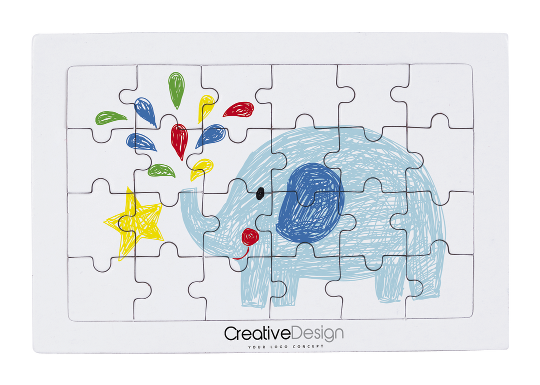 Divertido puzzle de 24 piezas en color blanco. Con caja de 4 ceras en colores amarillo, verde, azul y rojo incluida. 24 Piezas. 4 Ceras Incluidas
