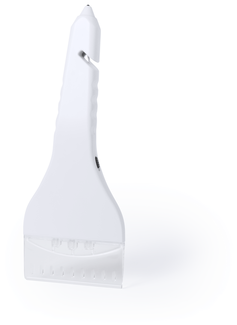 Rascador de hielo 4 en 1 en resistente material. Con linterna de 3 leds y 3 modos de iluminación, martillo rompe cristales y cuchilla corta cinturones. 3 Ledes. 4 Funciones. Pilas Botón Incluidas