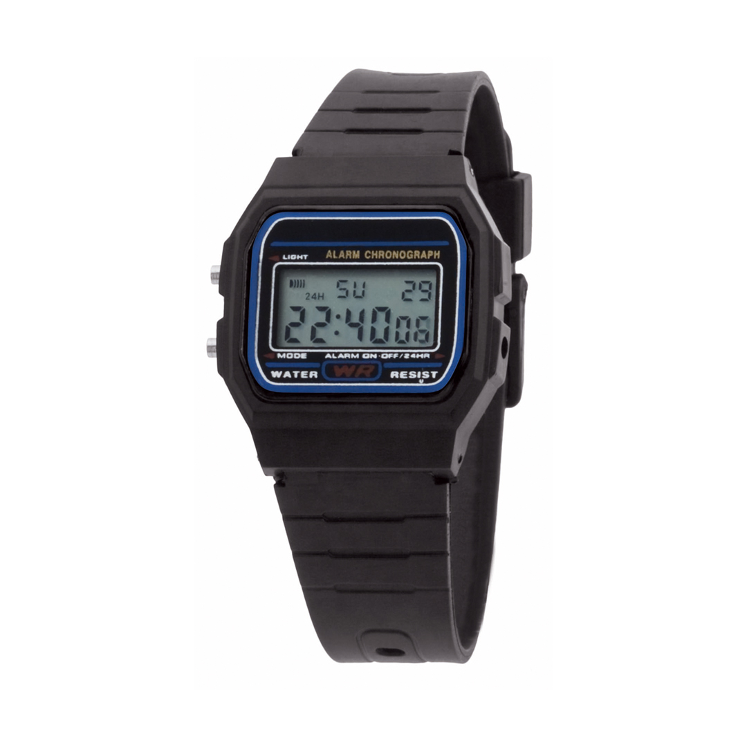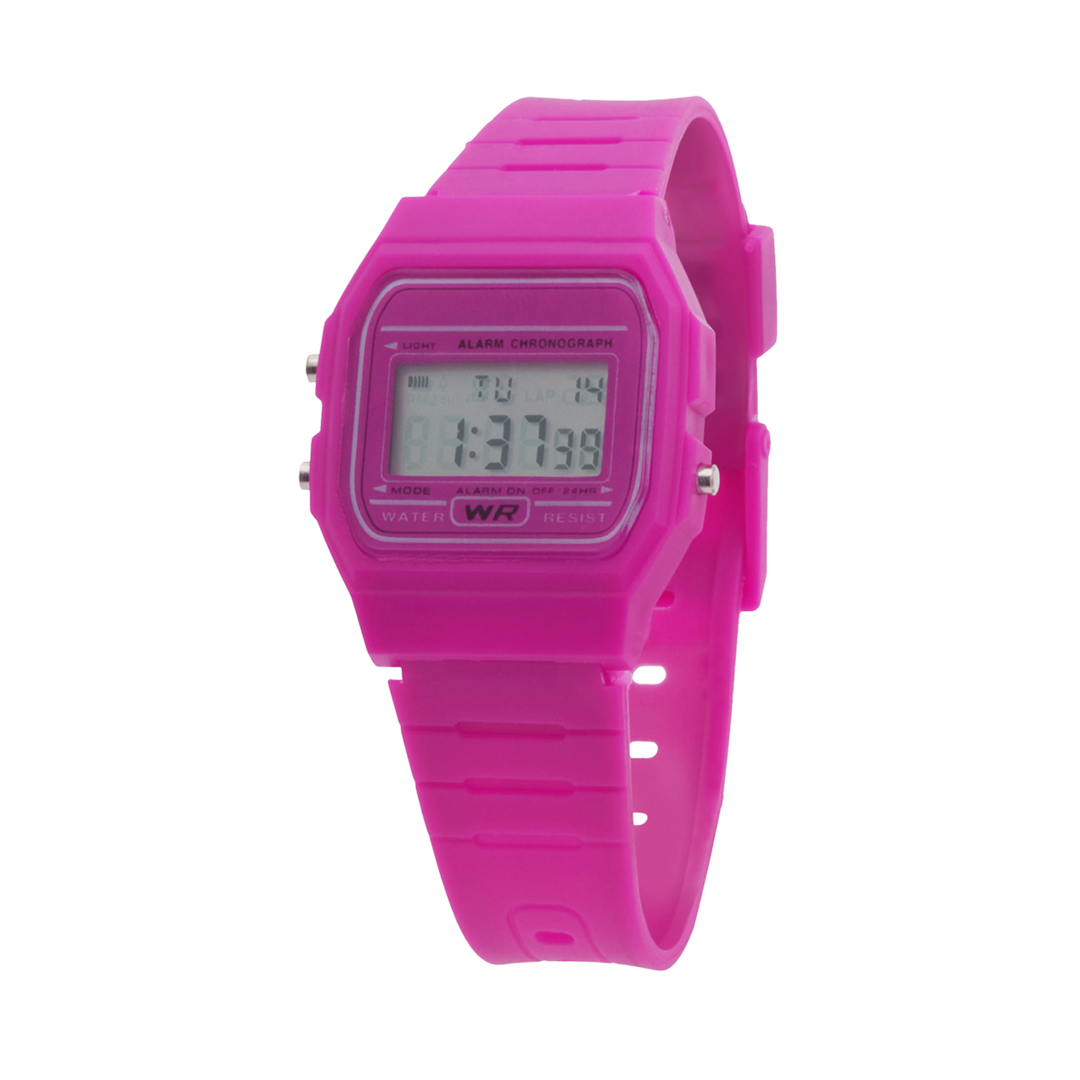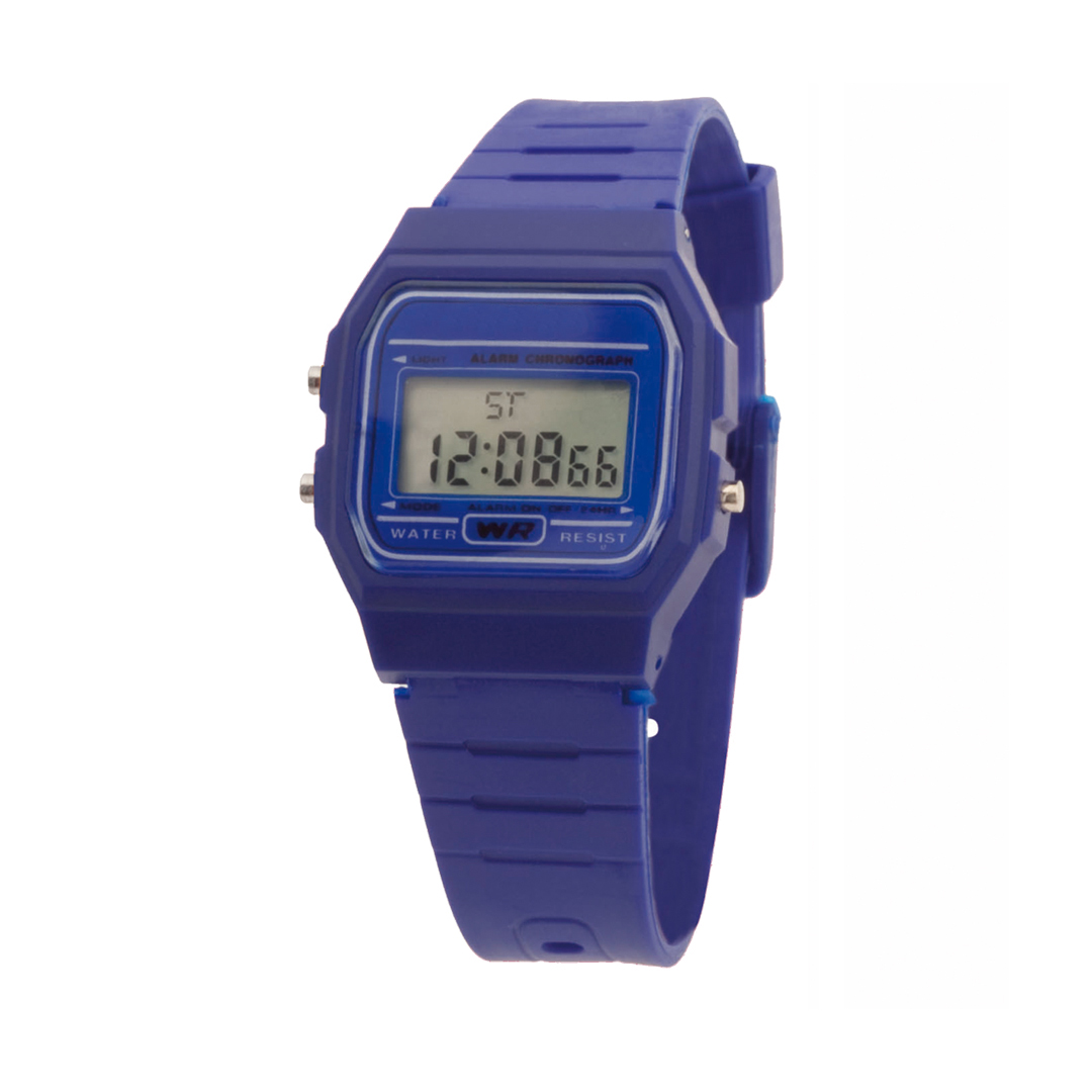 Reloj digital de pulsera de diseño retro en desenfadados colores. Con caja y correa a juego, función cronómetro y pantalla con luz. Resistente a salpicaduras de agua. Presentado en bolsa individual con cartulina de refuerzo.