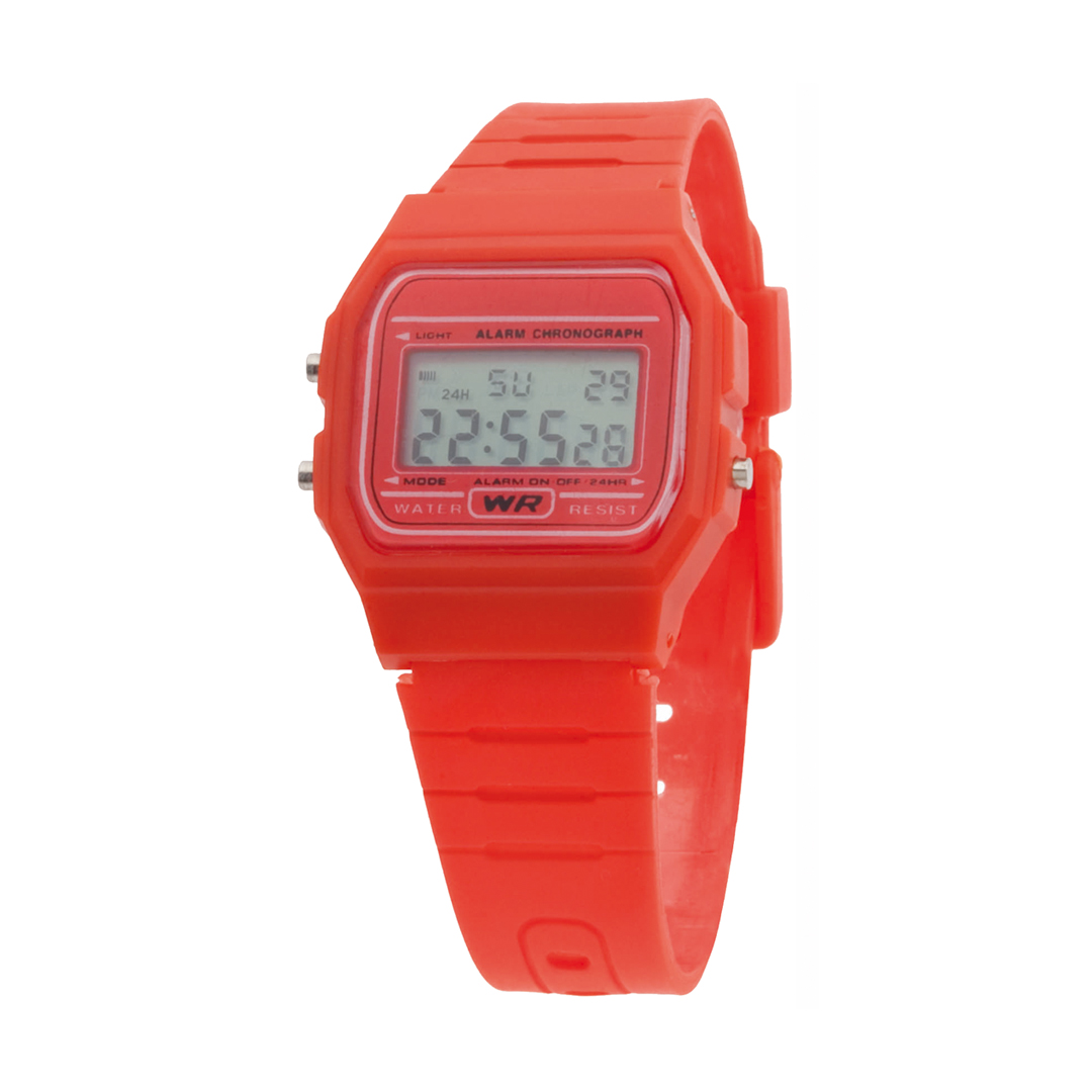 RojoReloj digital de pulsera de diseño retro en desenfadados colores. Con caja y correa a juego, función cronómetro y pantalla con luz. Resistente a salpicaduras de agua. Presentado en bolsa individual con cartulina de refuerzo.