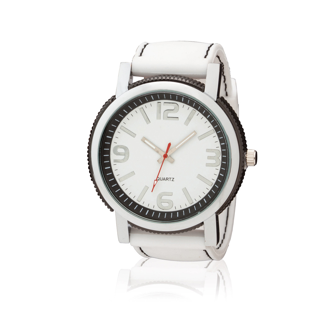 Reloj de pulsera de desenfadado diseño con caja metálica de dial analógico circular resistente a salpicaduras de agua. En alegres colores y con correa ajustable en silicona con costuras en blanco de cierre de hebilla. Presentado en bolsa individual con ca