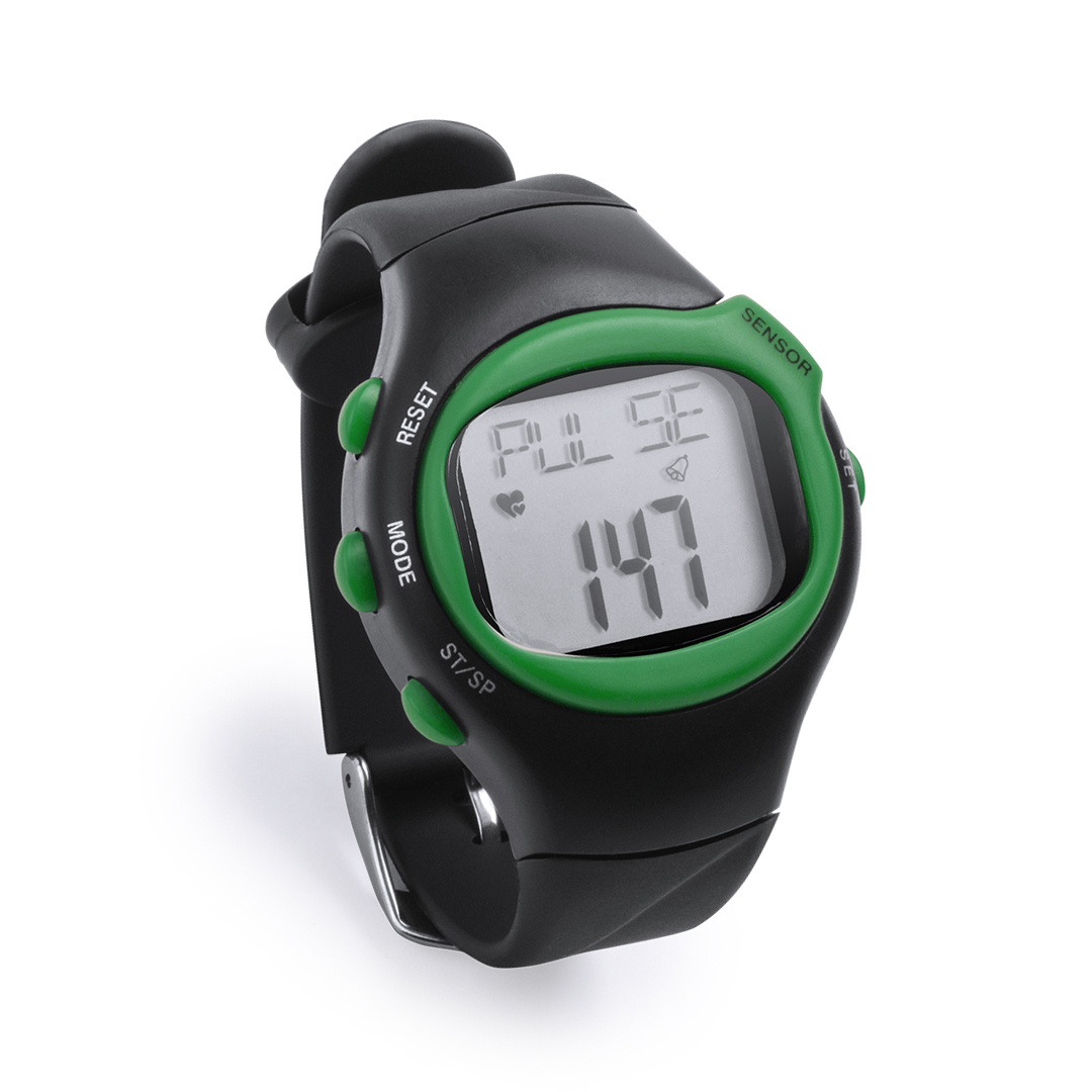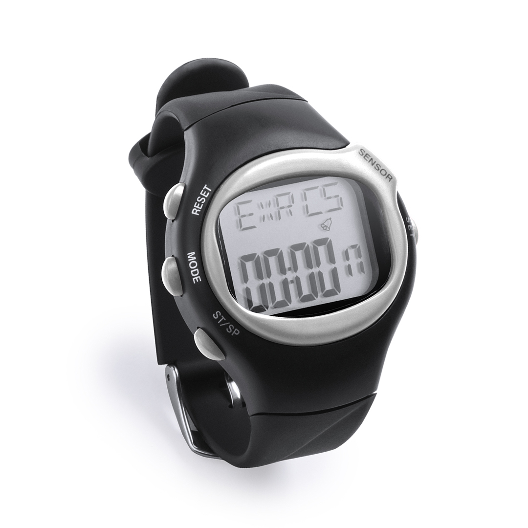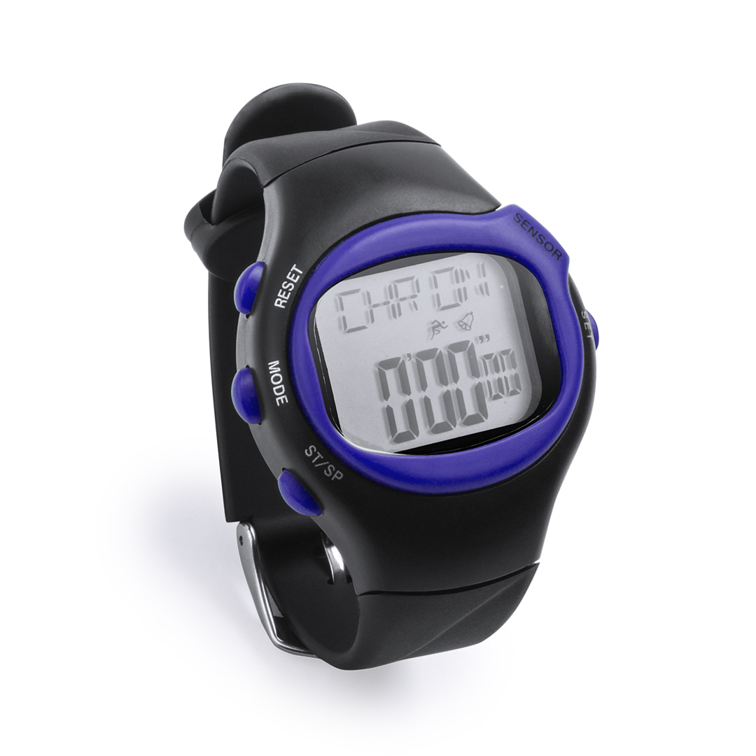 Desenfadado reloj pulsómetro digital de corte deportivo con pantalla LCD, cómoda correa ajustable y resistente a las salpicaduras de agua. Indicado para todo tipo de actividades deportivas y de ocio. Funciones fecha y hora, pulsómetro, cronómetro y podóme