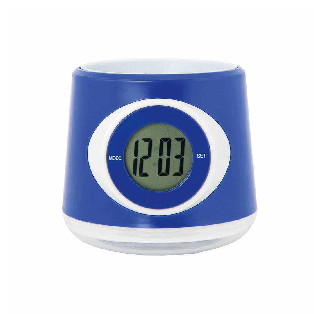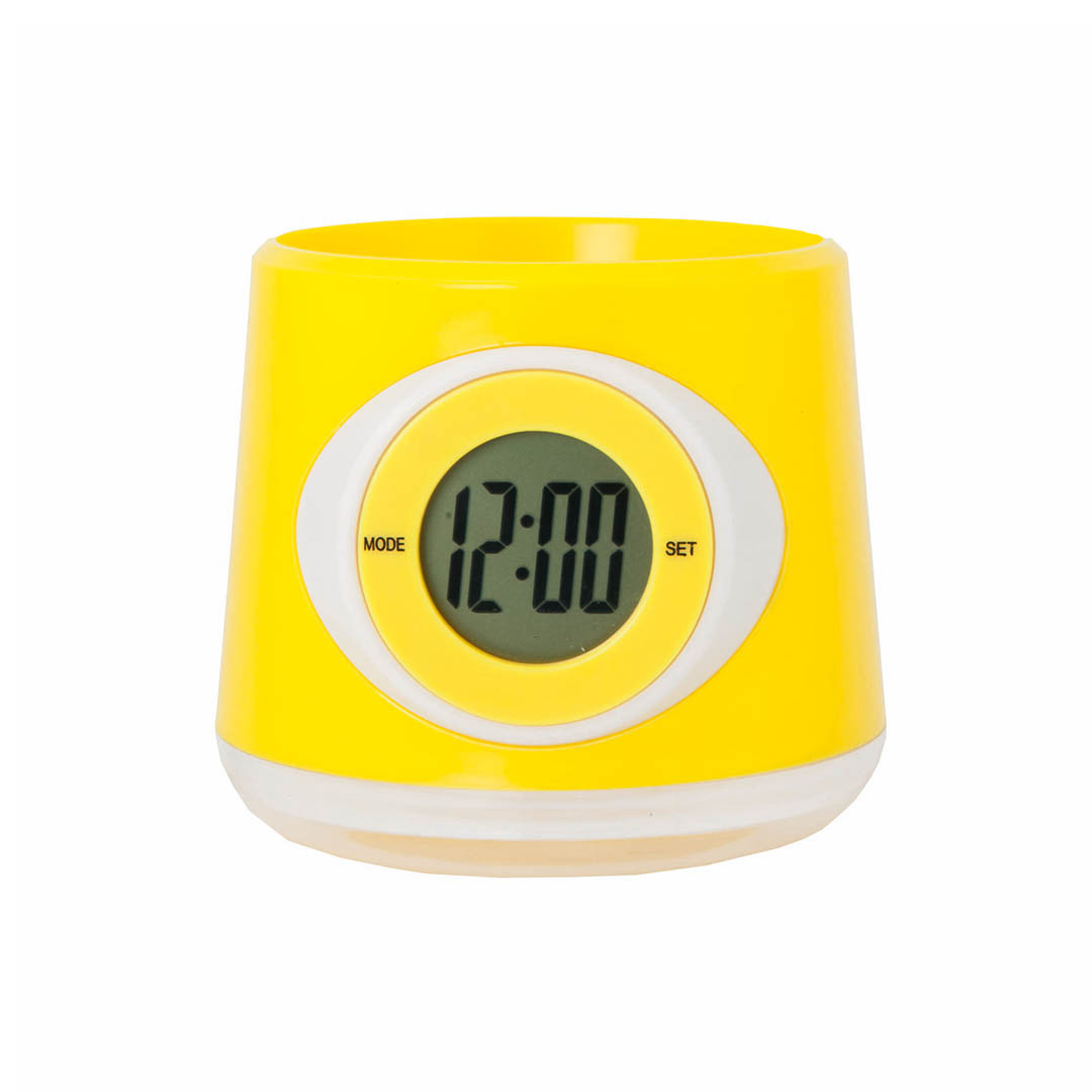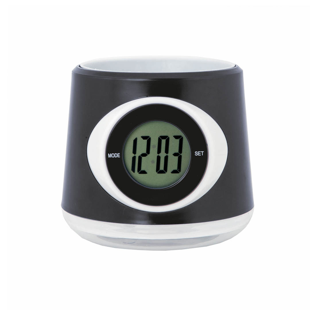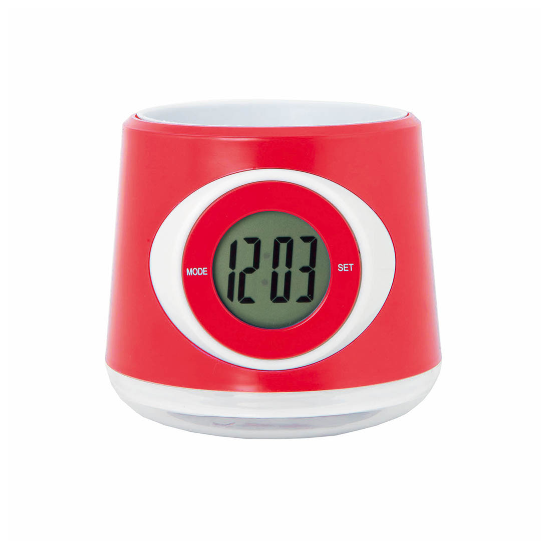 Reloj digital de sobremesa con macetero integrado y en original diseño bicolor. Pilas de botón incluidas con film protector y presentado en caja individual. Pila Botón Incluida