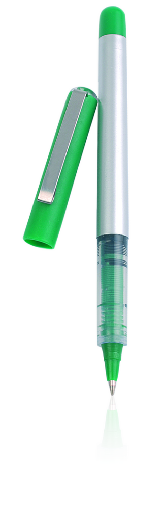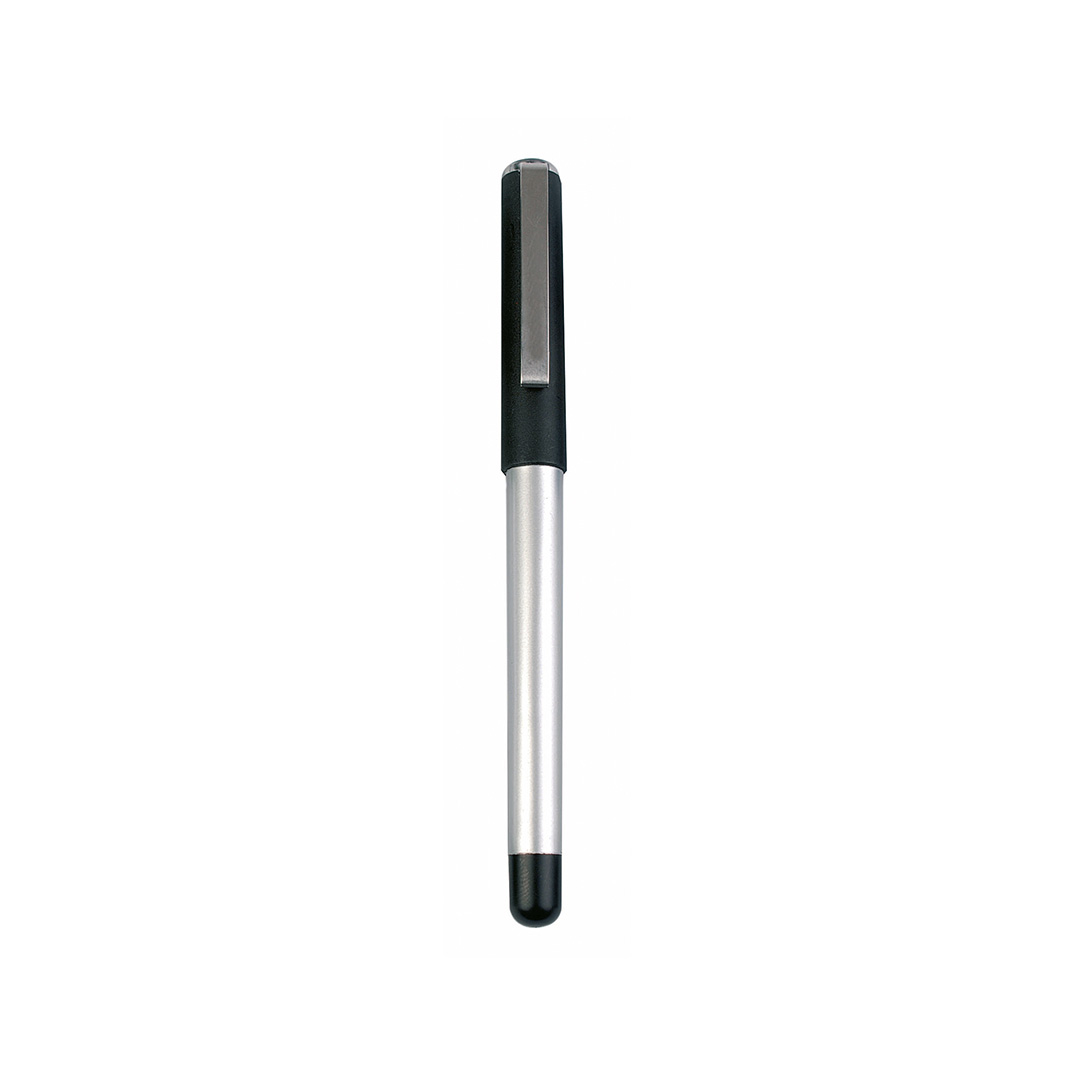 Roller de capucha de elegante diseño bicolor con cuerpo de suave acabado en color plateado brillante. Con accesorios en vivos colores sólidos y punta juego. Clip metálico y tinta azul. Carga Jumbo