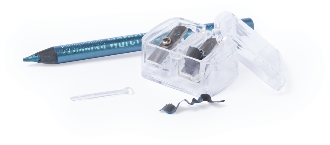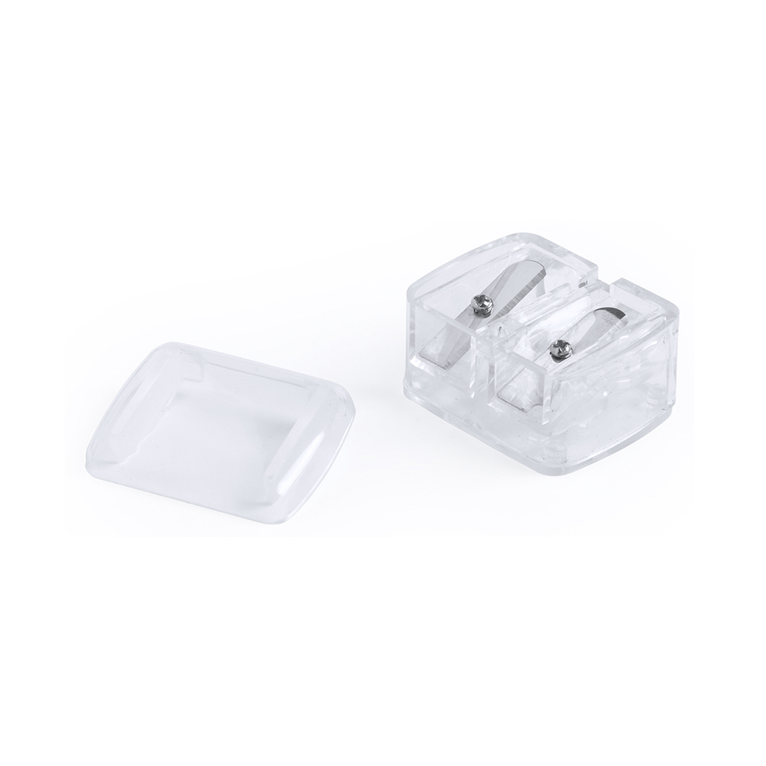 Sacapuntas de cosmética con doble cuchilla de acabado transparente. Con compartimento para residuos y tapa.