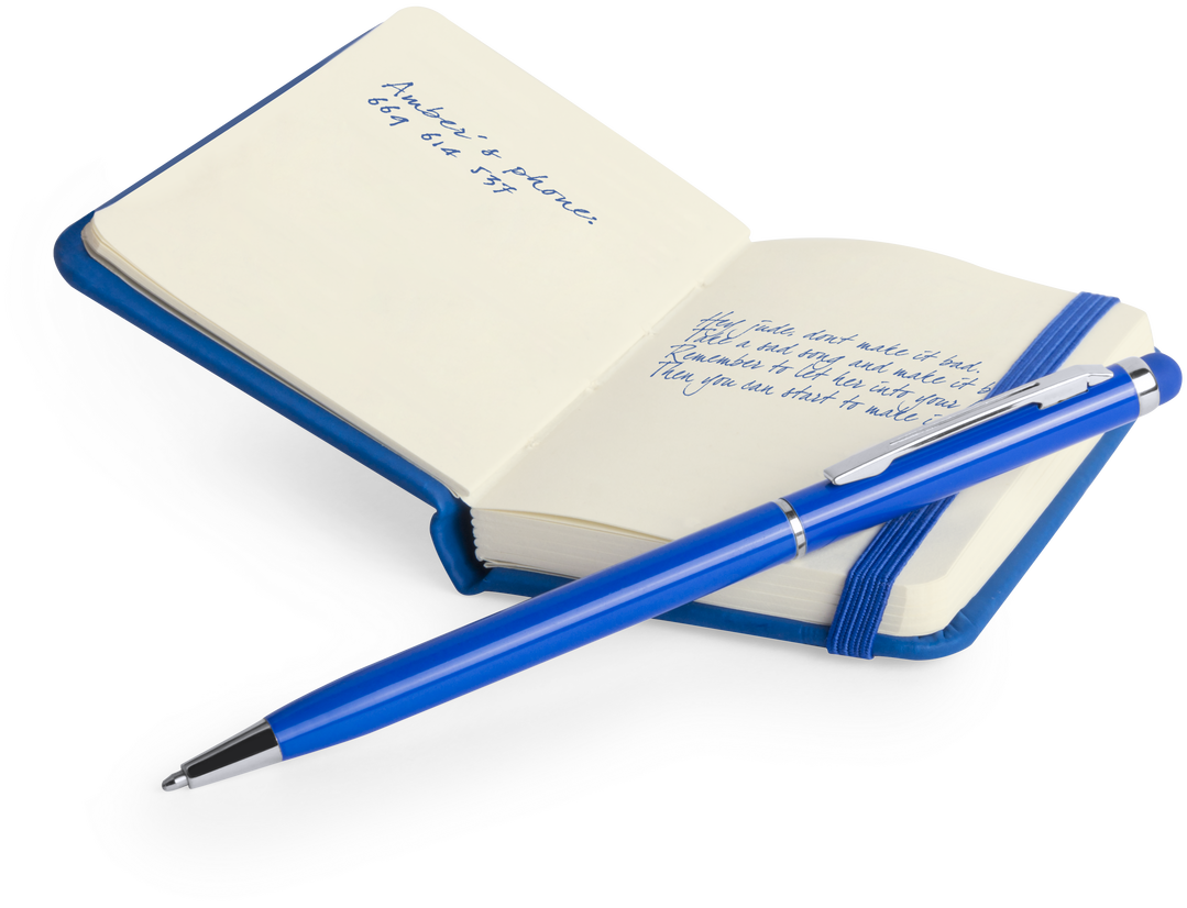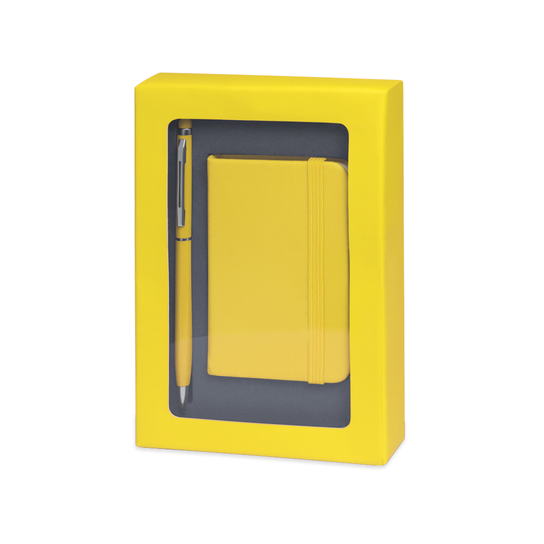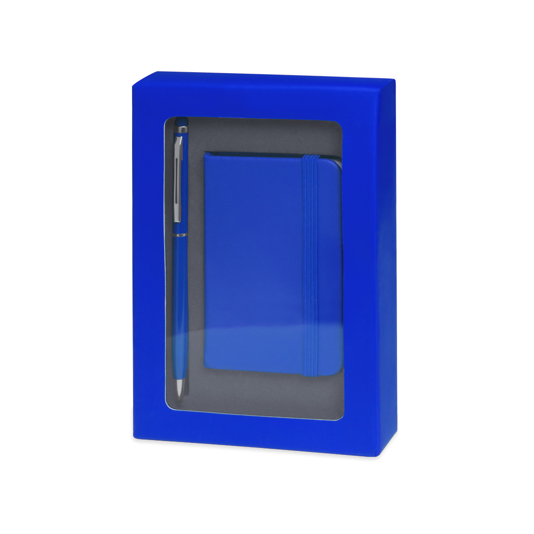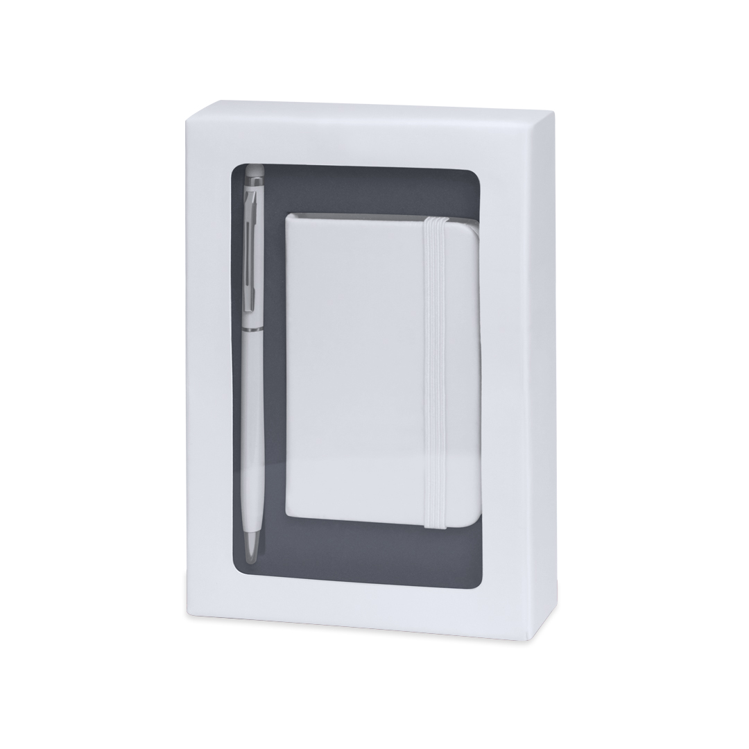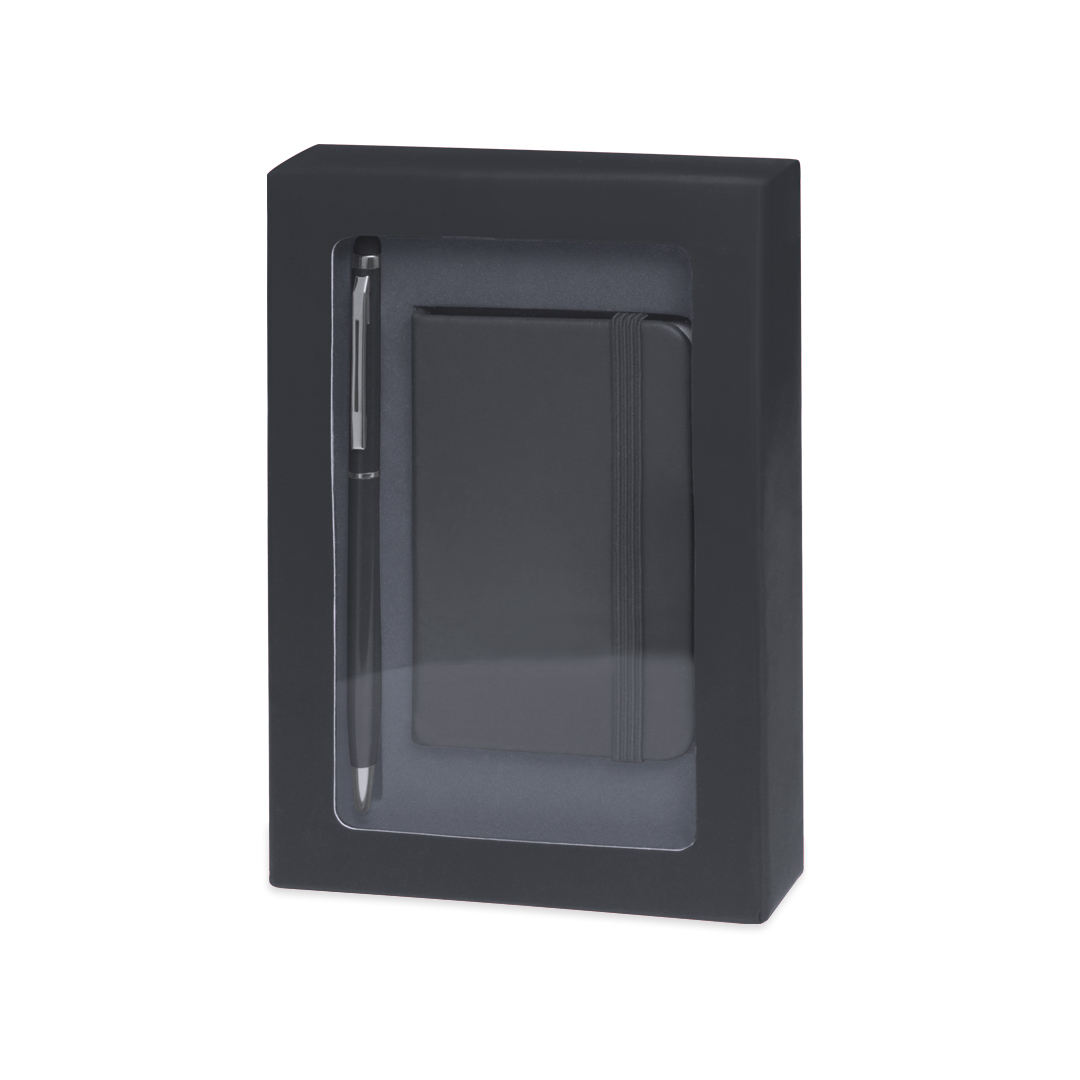 Set de bloc de notas con tapas de suave tacto acabadas en polipiel y bolígrafo de aluminio con puntero a juego. De 80 hojas lisas con elástico de sujeción y marcapáginas de tela a juego. Presentado en elegante estuche de cartón con ventana a juego y de su Portada Rígida. Bloc 80 Hojas