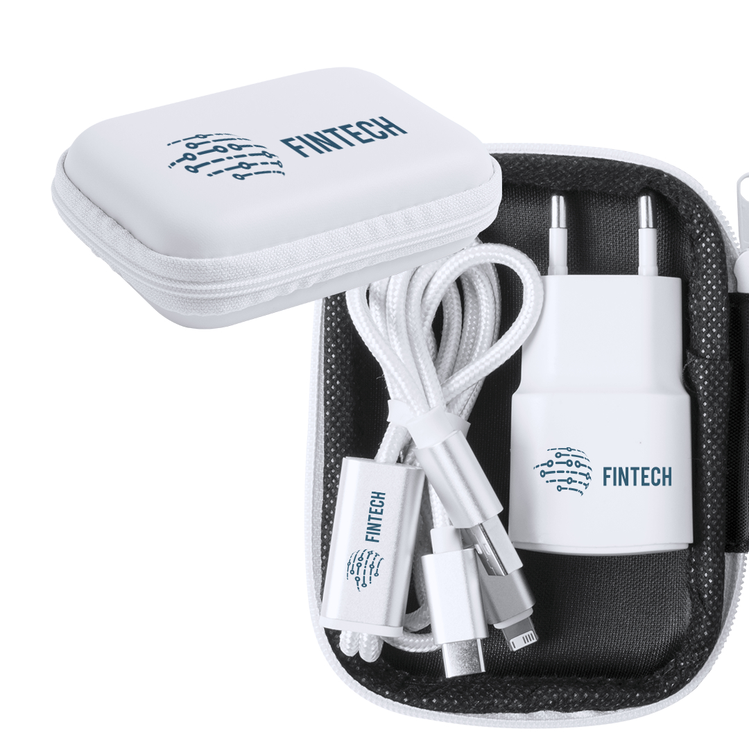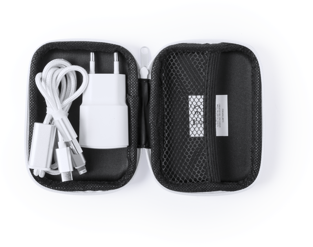 Set de cargadores USB premium. Incluye cargador para enchufe de pared y cables de carga largos -90 cm- con conexiones Tipo-C, dual Micro USB y Lightning. 1.000 mA de capacidad de carga, en elegante diseño de color blanco y presentados en resistente estuch Cargador USB 1000 mA. Cable Incluido Conexión Micro USB, Tipo C y Lightning