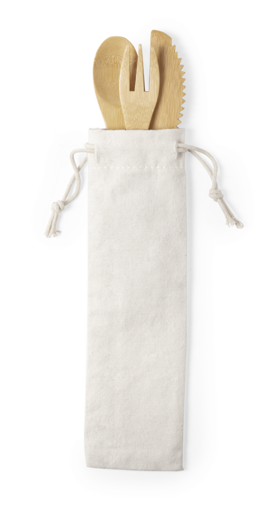 Set de 3 cubiertos de línea nature. Fabricados en bambú, incluye tenedor, cuchara y cuchillo. Presentados en funda de algodón con cordón auto cierre. 3 Piezas