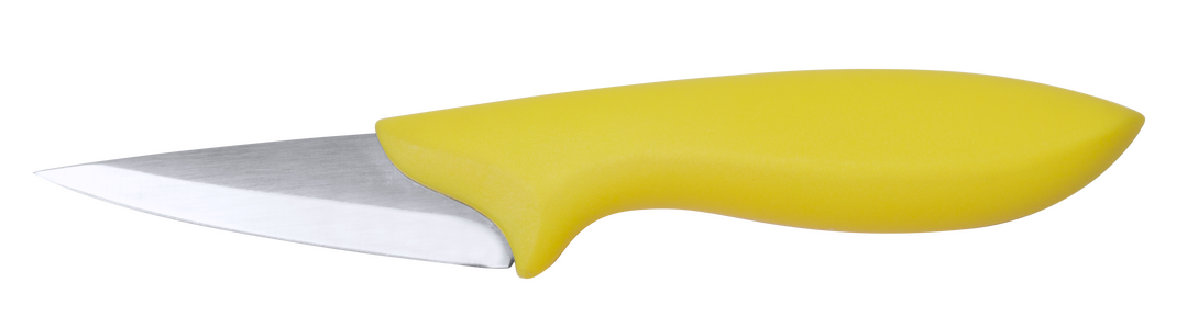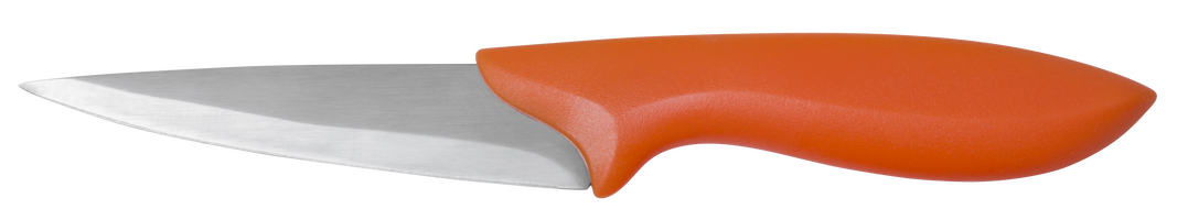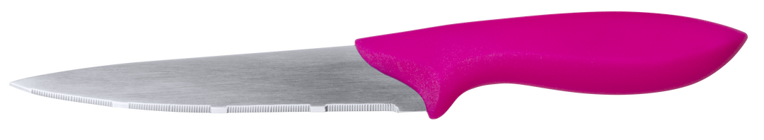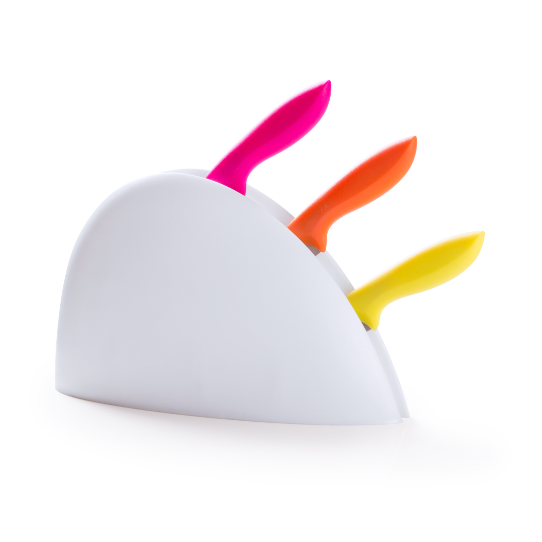 Set de cuchillos de diferentes tamaños con diferentes hojas en acero inox y suave mango ergonómico en alegres tonos. Con resistente soporte y presentados en caja individual. 4 Piezas