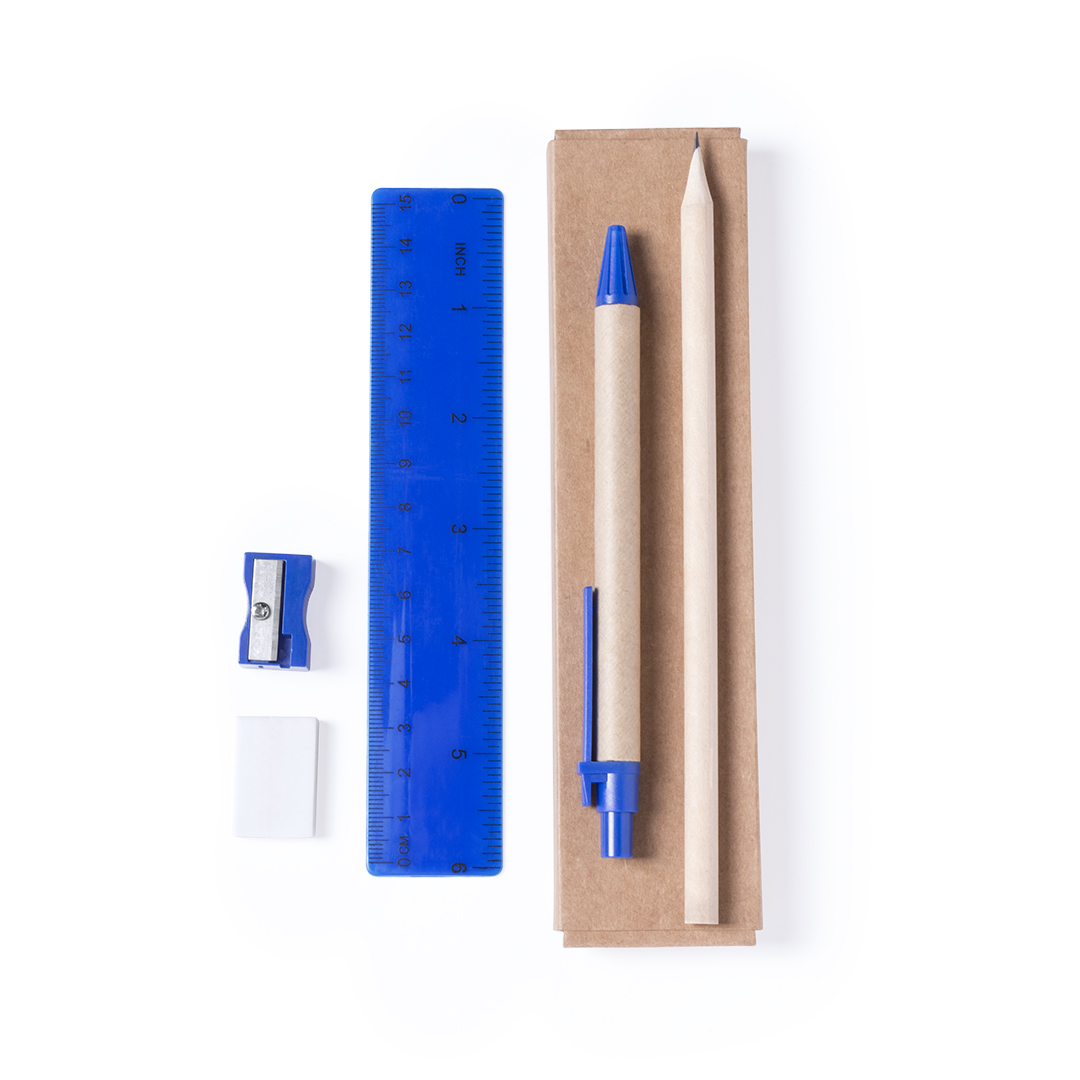 Set de 5 piezas en variada gama de vivos colores presentadas en estuche de cartón natural. Incluye bolígrafo de mecanismo pulsador y tinta azul en cartón reciclado, lápiz de cuerpo cilíndrico en madera, sacapuntas, goma y regla de 15cm. 5 Piezas