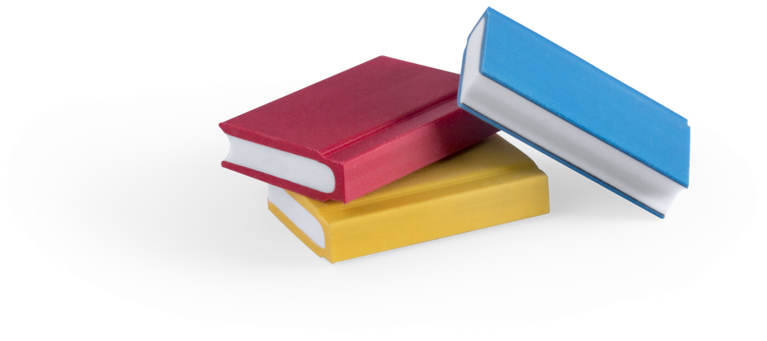 Divertido set de 4 gomas en forma de libro de alegres colores. Presentadas en cajita expositora de cartón blanco. 4 Piezas