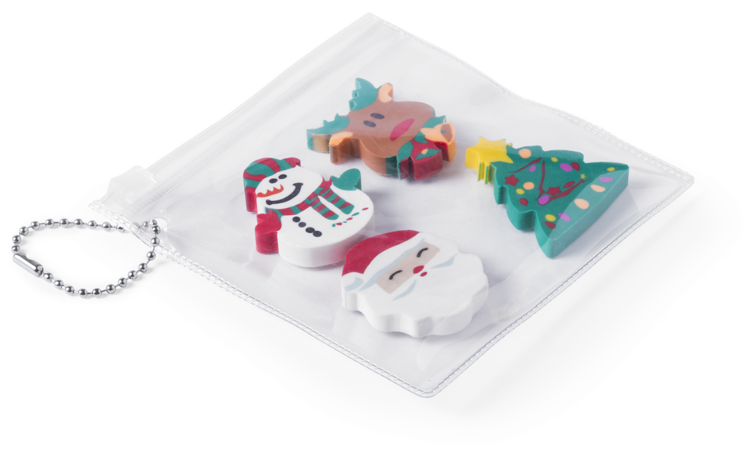 Set de gomas de borrar con originales diseños navideños. Presentadas en bolsa individual transparente con cierre zippery zona posterior blanca para impresión. Con cadenita de transporte. 4 Piezas