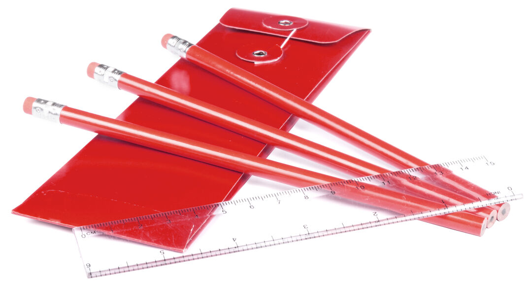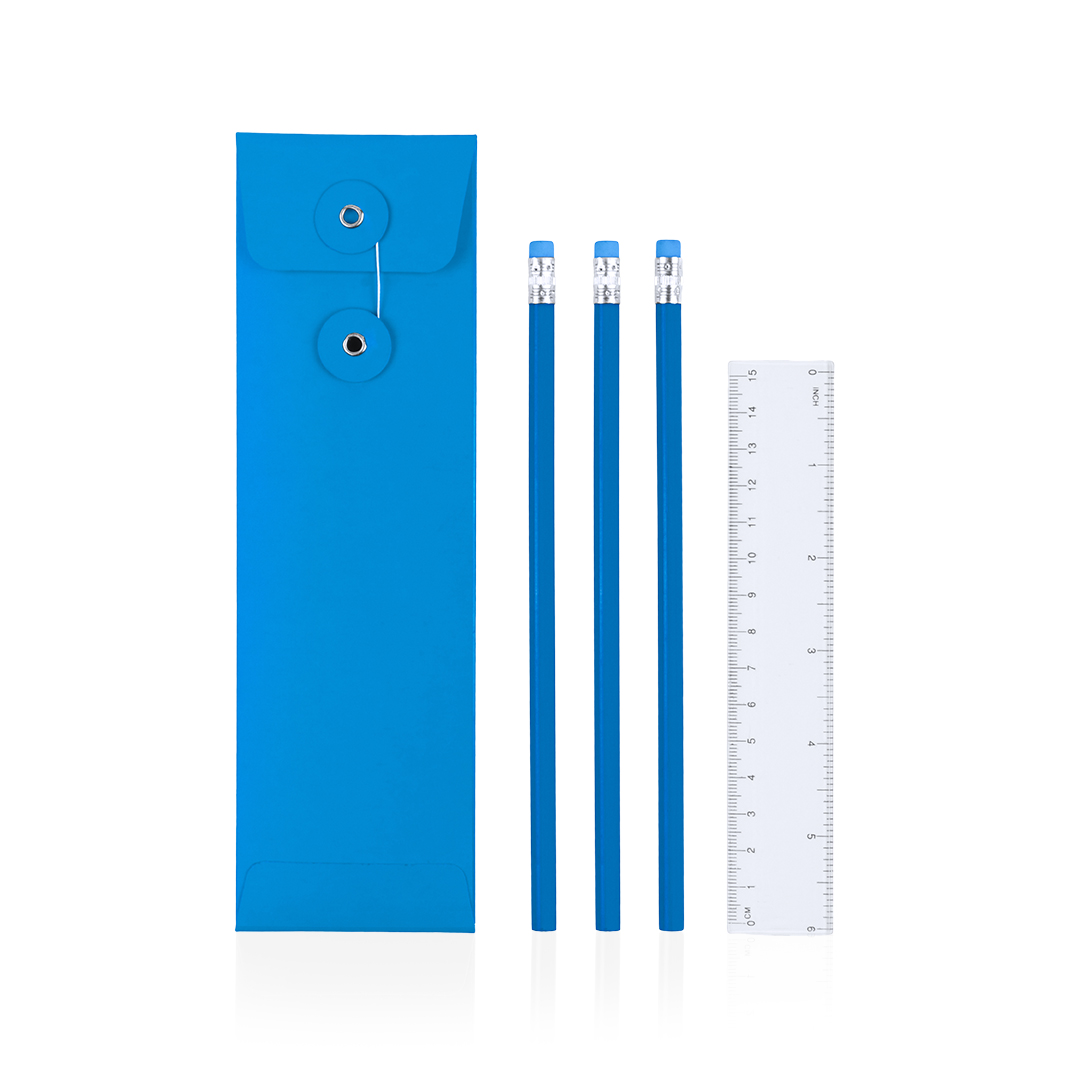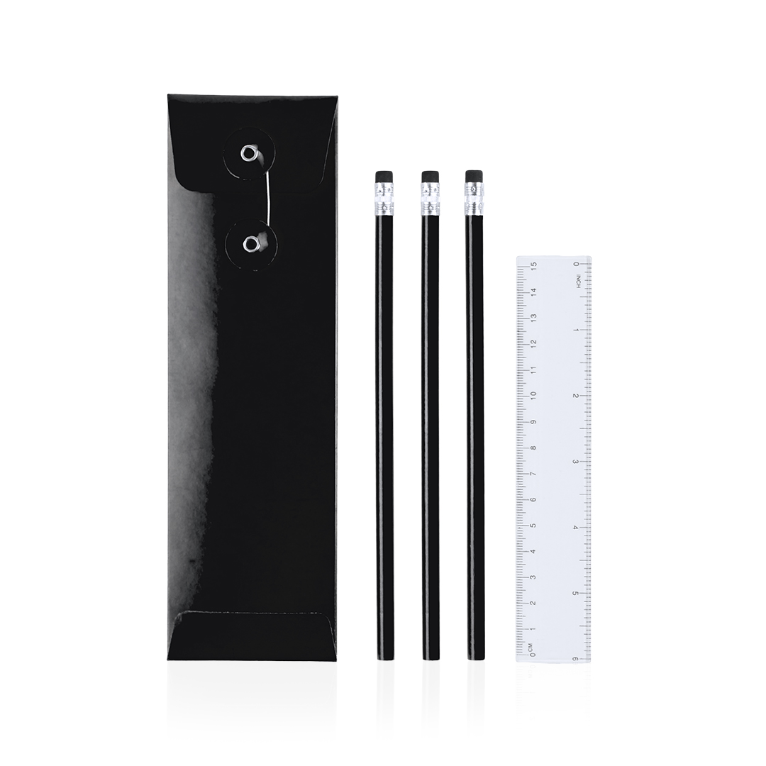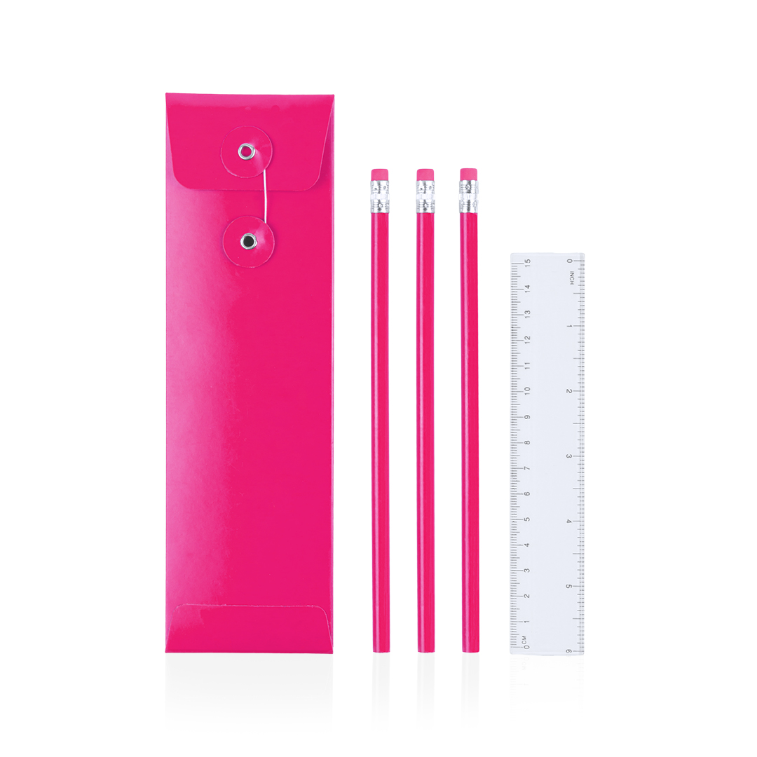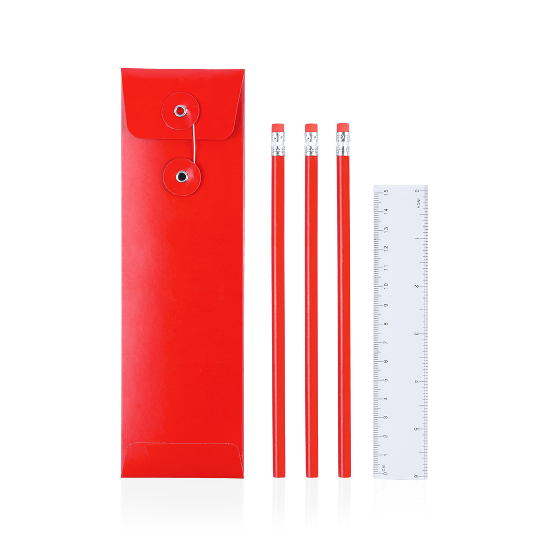 Set de 4 piezas con 3 lápices de madera con cuerpo redondo de acabado brillo en alegres colores con mina negra y regla transparente de 15cm con sistema métrico en centímetros/pulgadas. Presentado en estuche de cartón a juego con cierre de hilo. 4 Piezas