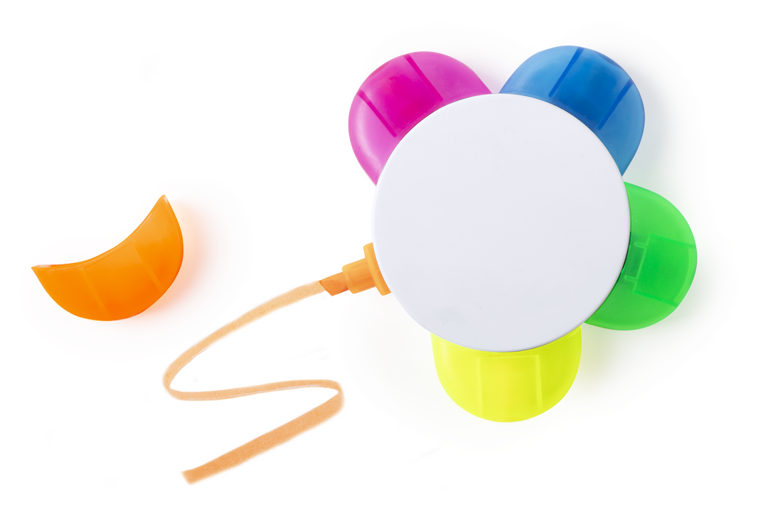Set de marcadores en original diseño flor. Con amplia superficie de marcaje y subrayadores en colores naranja, azul, verde, amarillo y fucsia. Escritura 5 Colores
