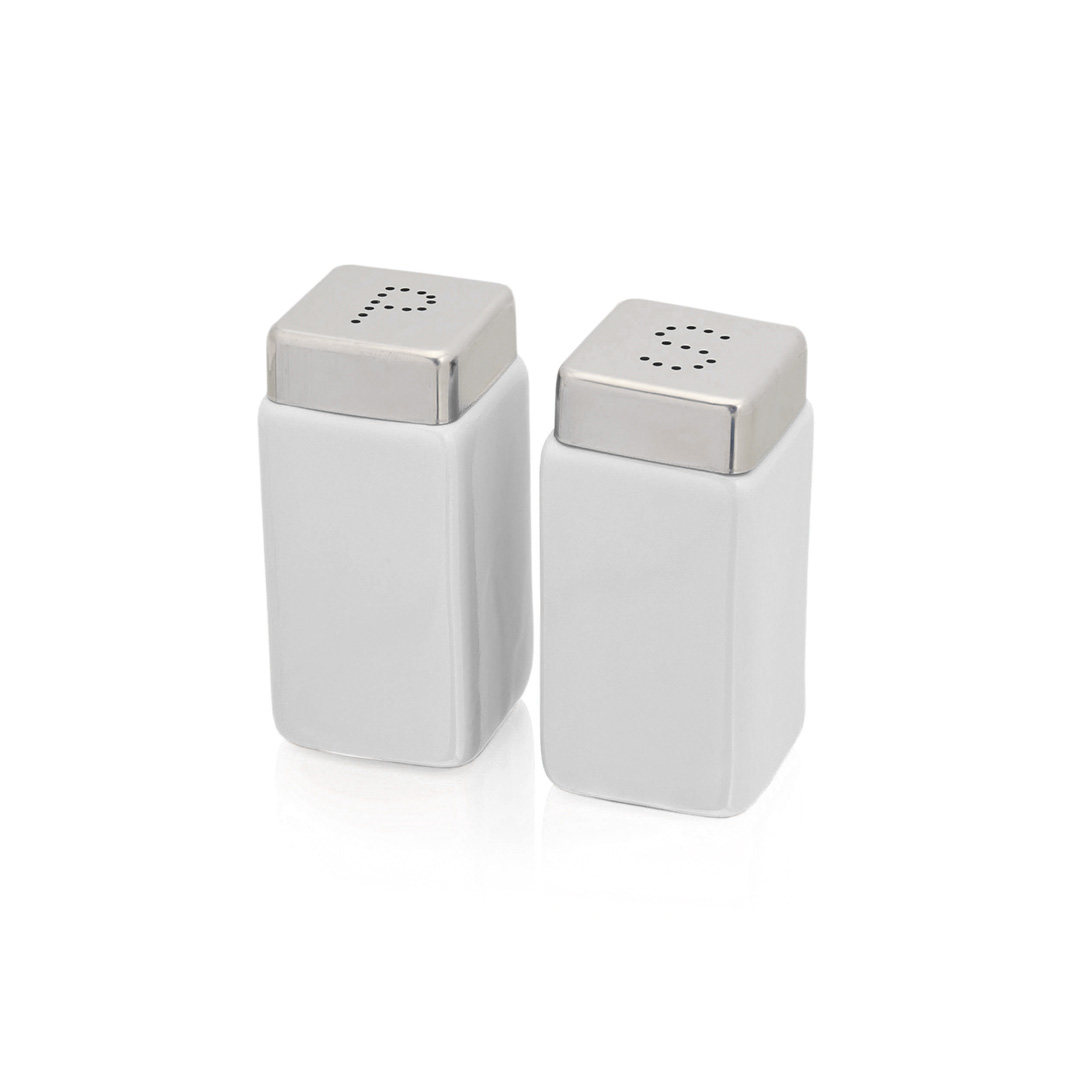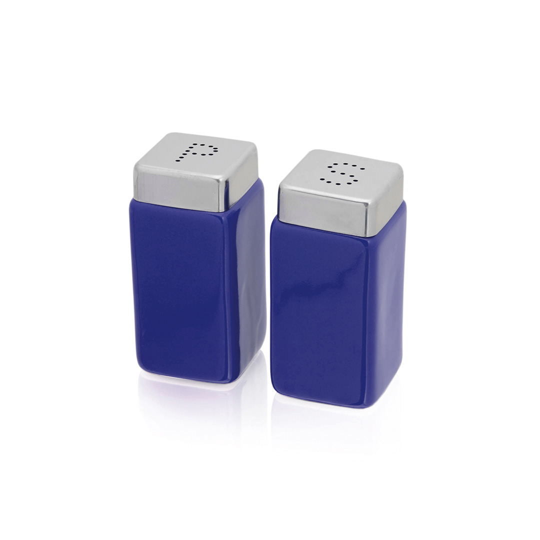 Set de 2 piezas para sal y pimienta en cerámica. De variados colores y con troquelado -S- y -P- en dosificador. Presentado en estuche de PVC. 2 Piezas