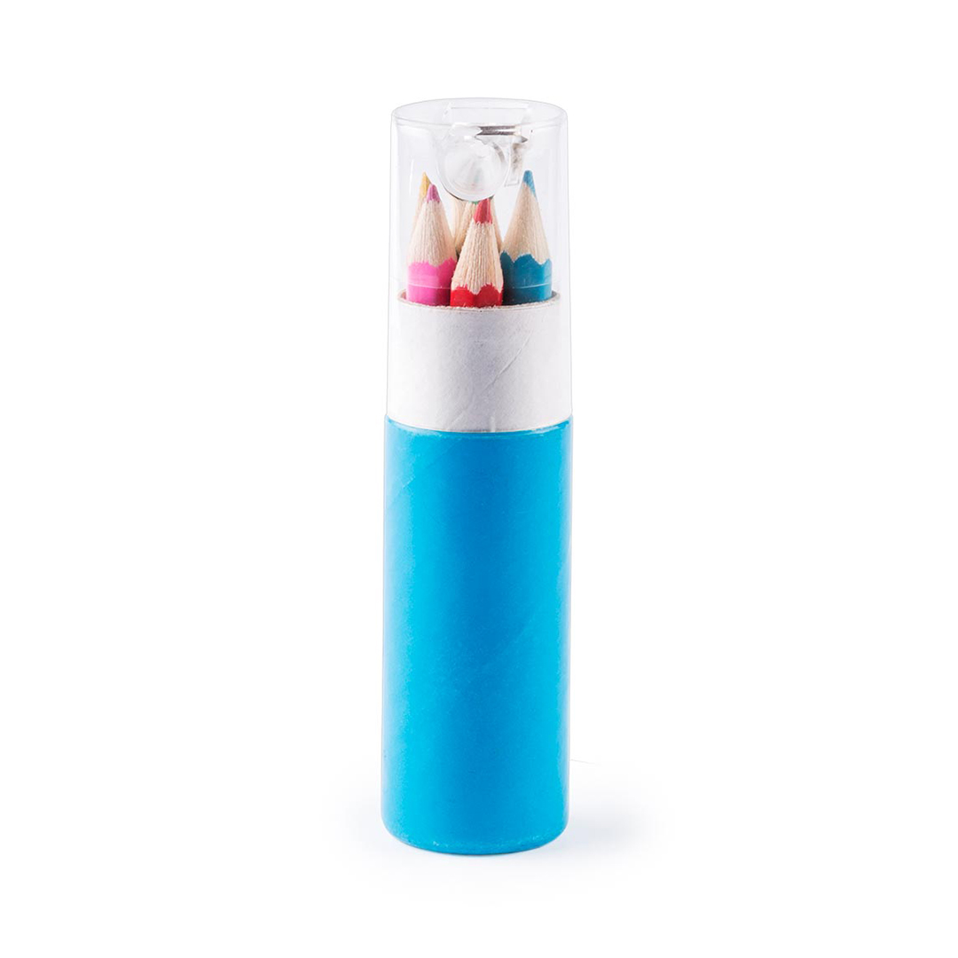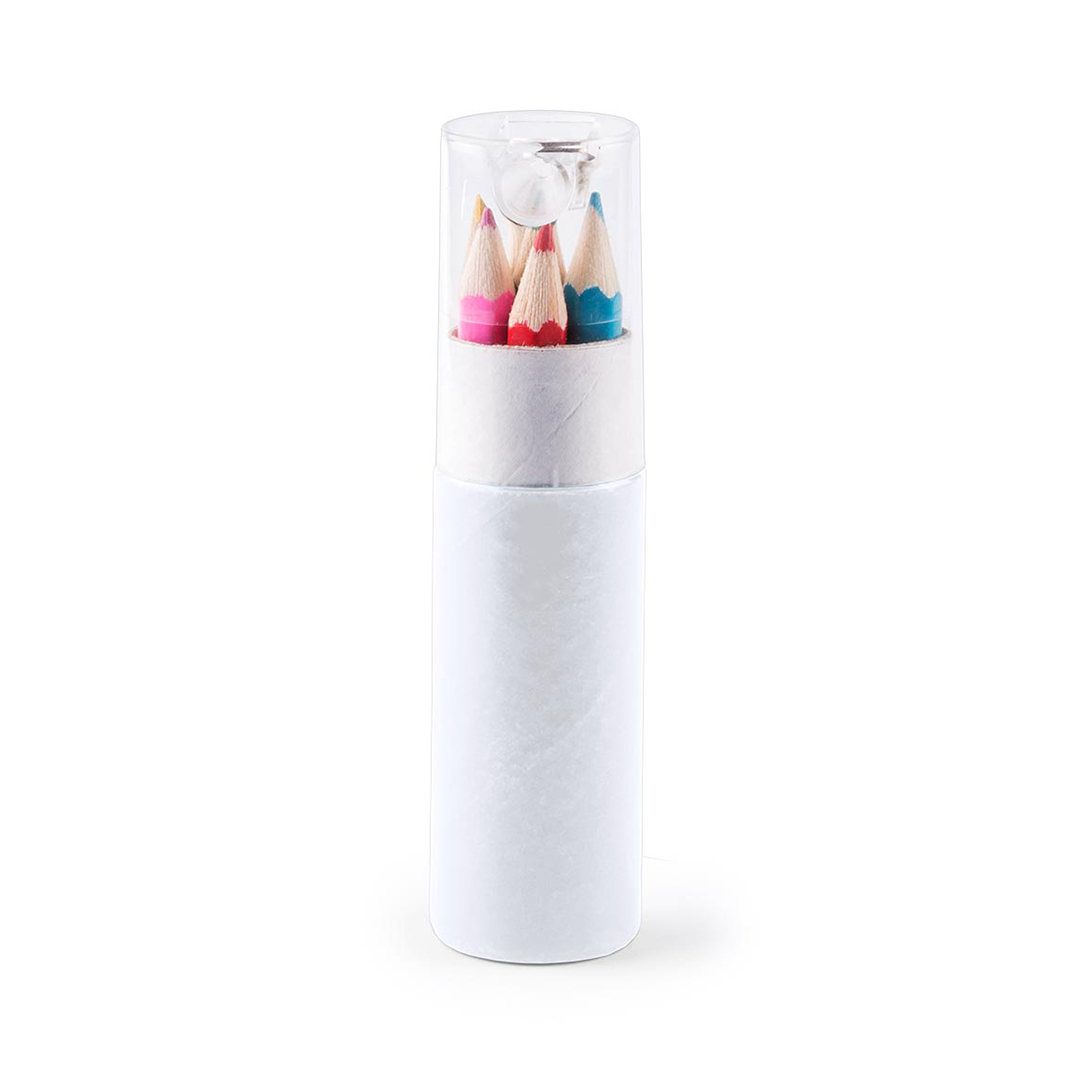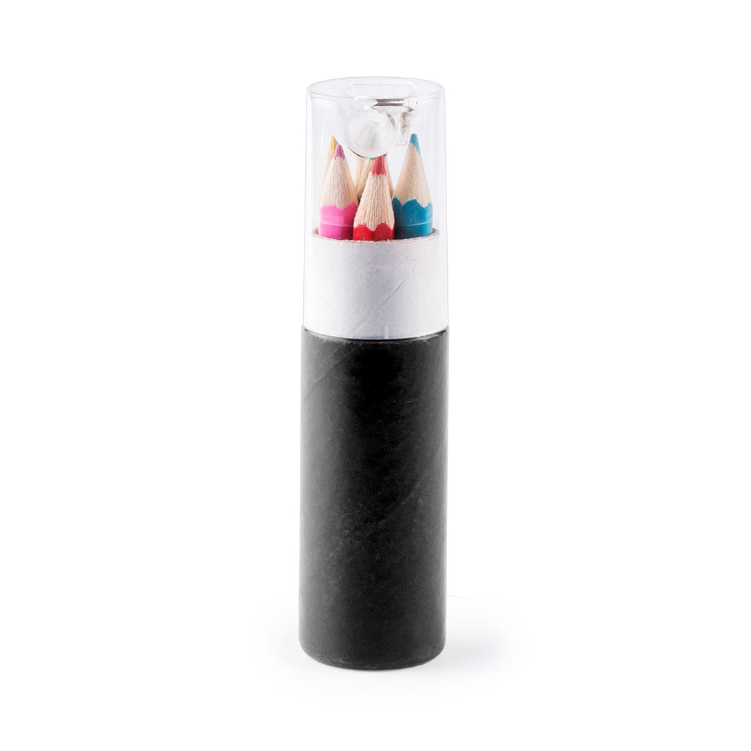 Set de 6 lápices de madera con cuerpo hexagonal de acabado brillante y minas en colores azul, rosa, negro, rojo, amarillo y verde. Con sacapuntas integrado en la capucha y presentado en estuche de cartón de vivos colores. 7 Piezas