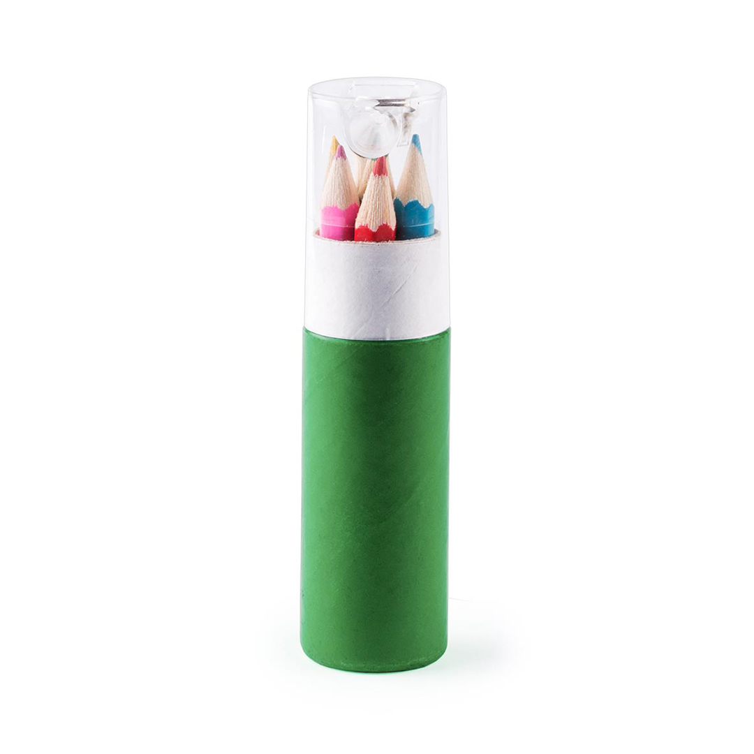 VerdeSet de 6 lápices de madera con cuerpo hexagonal de acabado brillante y minas en colores azul, rosa, negro, rojo, amarillo y verde. Con sacapuntas integrado en la capucha y presentado en estuche de cartón de vivos colores. 7 Piezas