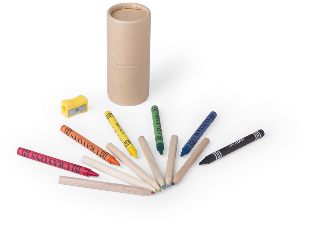 Set de 13 piezas en estuche cilíndrico de cartón natural. Incluye 6 lápices de madera con cuerpo hexagonal de acabado natural y minas en variados colores, sacapuntas en color amarillo y 6 ceras de cuerpo cilíndrico en variada gama de vivos colores. 13 Piezas