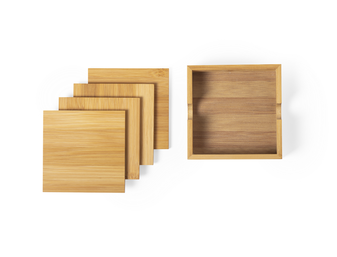 Set de 4 posavasos de línea nature en cajita. Fabricado en bambú lacado y presentado en atractiva caja individual de diseño eco. 4 Piezas