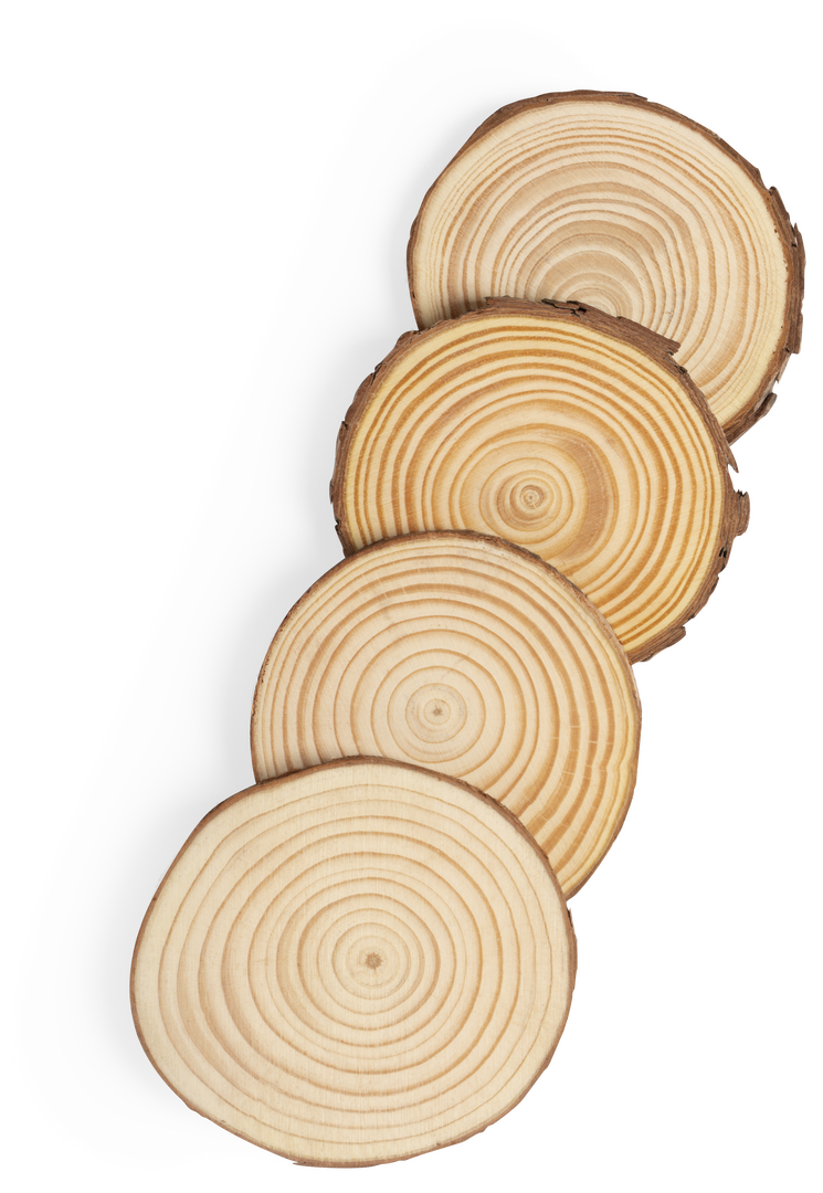 Set de posavasos en madera de pino natural. Incluye 4 piezas de aproximadamente 1cm de grosor. Corte natural, con diámetros de posavasos entre 8 y 10 cm, con cuerda en yute natural. 4 Piezas