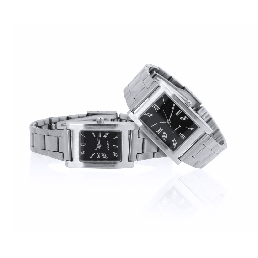 Elegante set de relojes de pulsera para hombre y mujer. Caja metálica de dial analógico rectangular y correa metálica ajustable. Presentado en estuche individual en color negro con cierre magnético e interior troquelado.