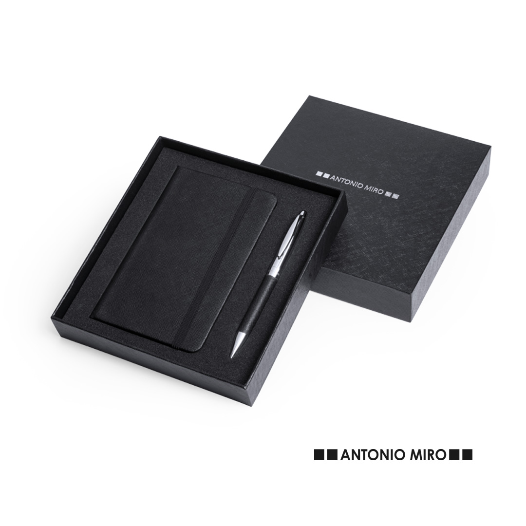 Set de Antonio Miró con bloc de notas de tapas de tacto granulado acabadas en polipiel y bolígrafo metálico de cuerpo en polipiel granulada a juego. De 100 hojas lisas con elástico de sujeción y marcapáginas de tela a juego. Presentado en elegante estuche Portada Rígida. Bloc 100 Hojas