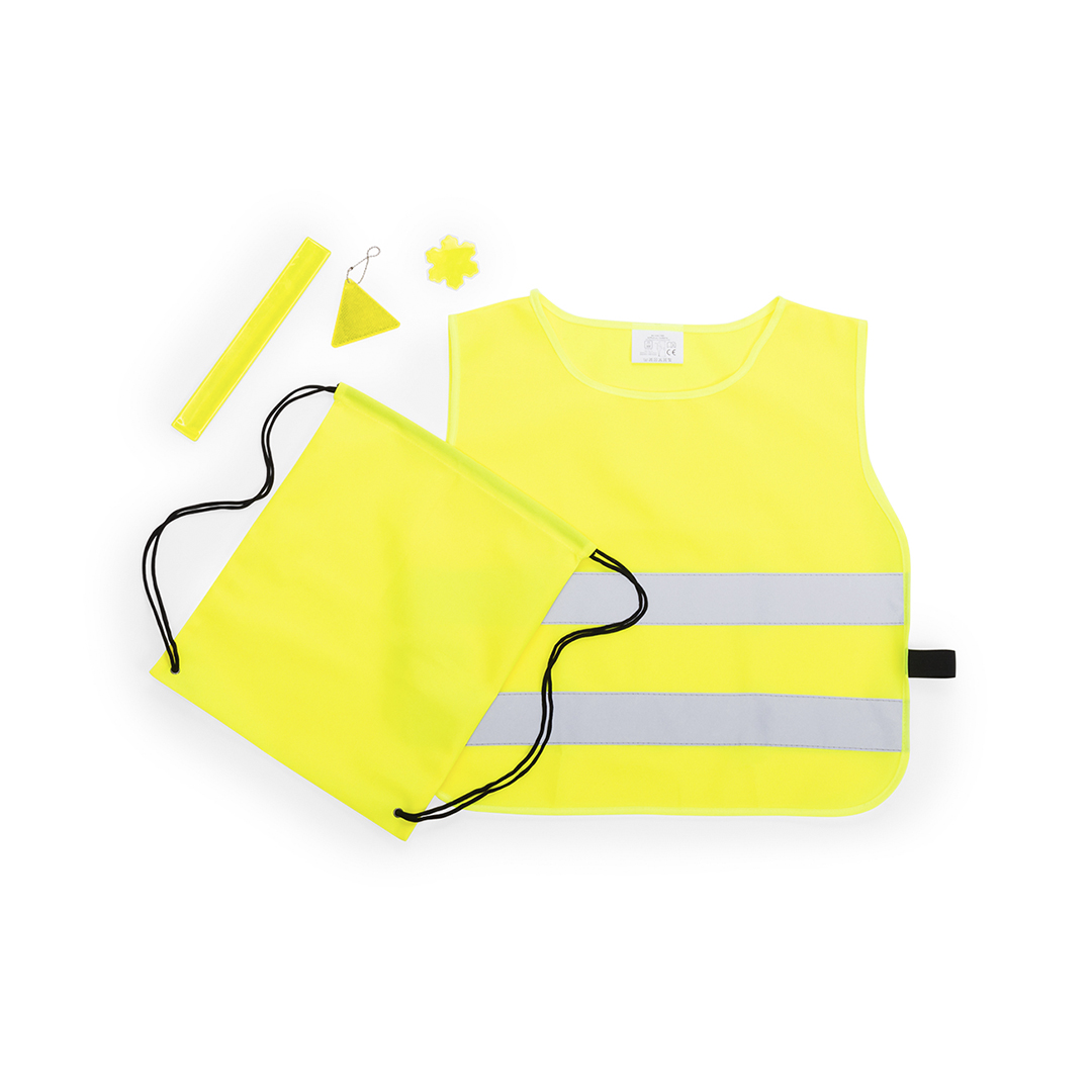 Set seguridad infantil en color amarillo de alta visibilidad. Incluye chaleco reflectante, mochila de cuerdas de 28x33cm, llavero reflectante en PVC, pulsera reflectante con mecanismo de ajuste automático y pegatina reflectante. 5 Accesorios. Chaleco Poliéster. Talla Única. Niño
