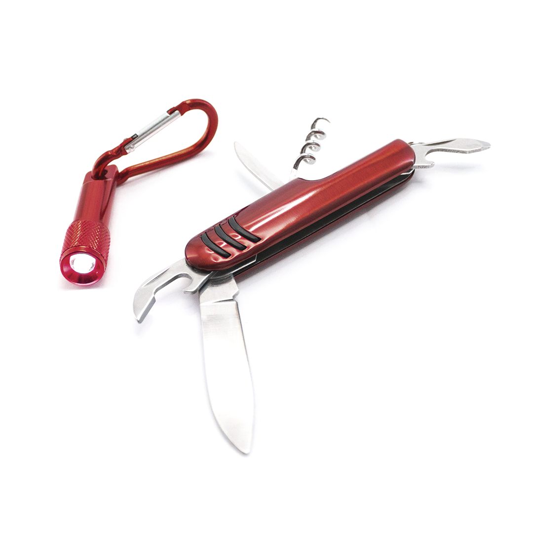 Set de aluminio de navaja multiusos con 7 funciones y linterna mosquetón. En variados colores y presentado en estuche individual con ventana y suave espuma interior troquelada. Pilas de botón incluidas. 1 Led. Navaja 7 Funciones. Pilas Botón Incluidas