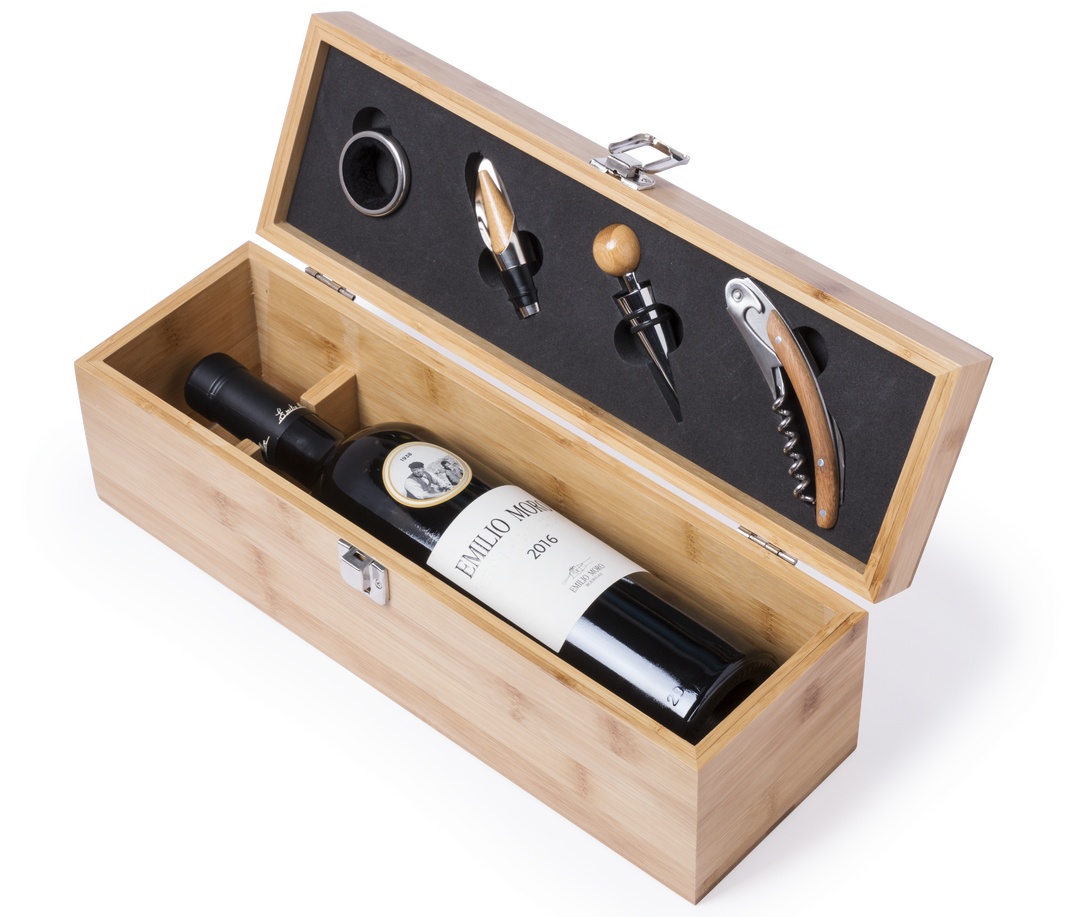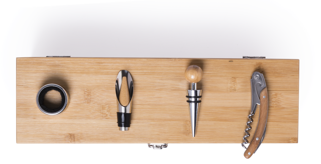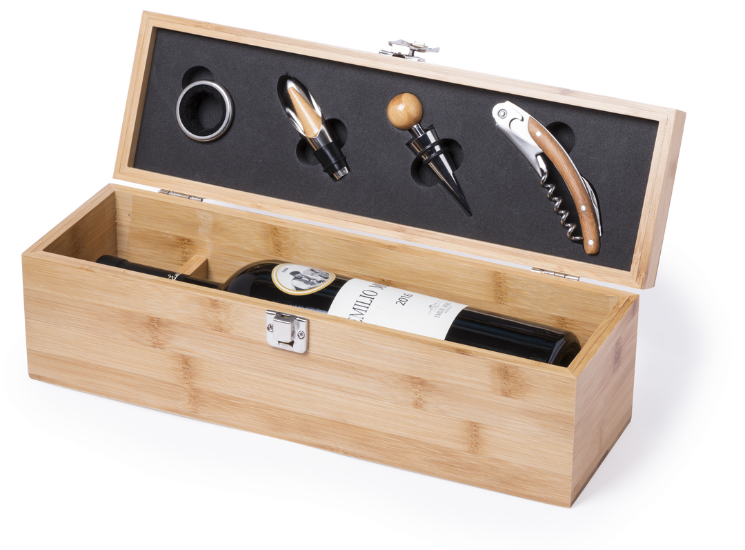 Set de vinos premium acabado en madera bambú. Accesorios de acero inox. Incluye sacacorchos, cortacápsulas, tapón, dosificador y recogegotas. Presentado en estuche individual de madera de bambú, con compartimento interior para botella de vino -no incluida 4 Accesorios
