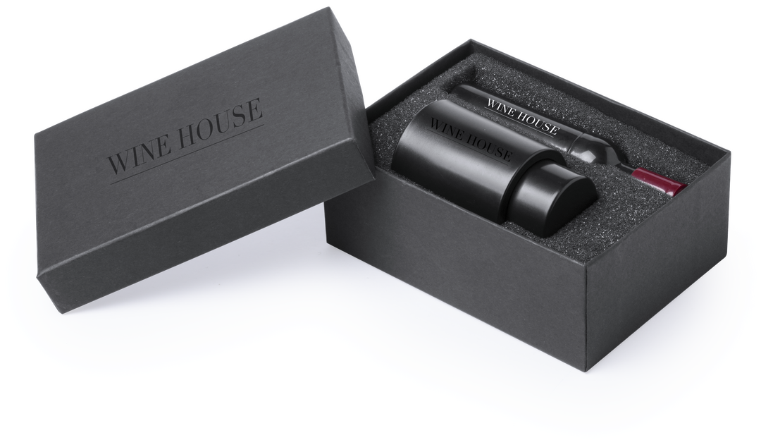 Original set de vinos con sacacorchos en forma de botella de vino y tapón con bomba de vacío. Presentado en estuche individual de cartón negro con interior en suave espuma troquelada. 2 Accesorios