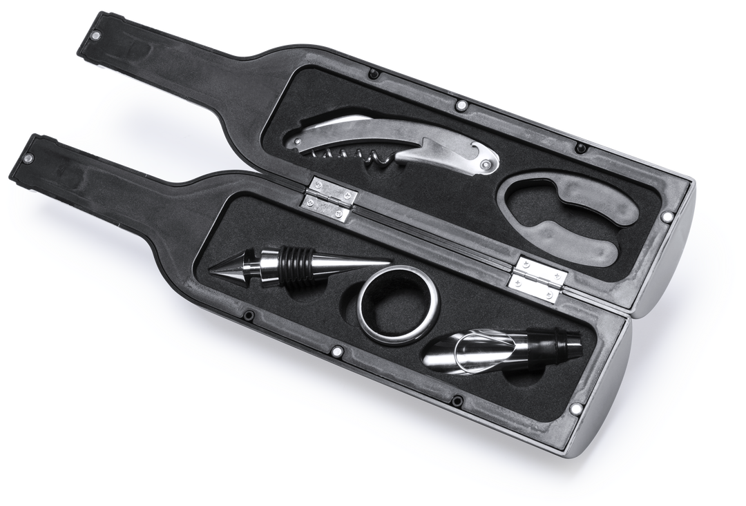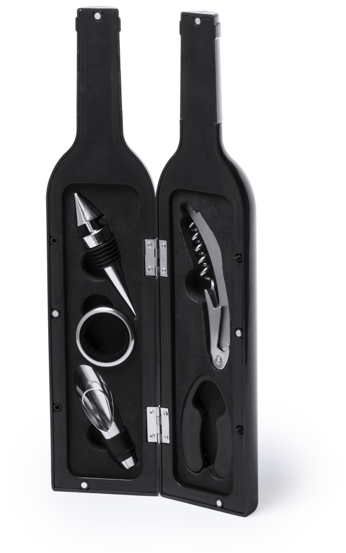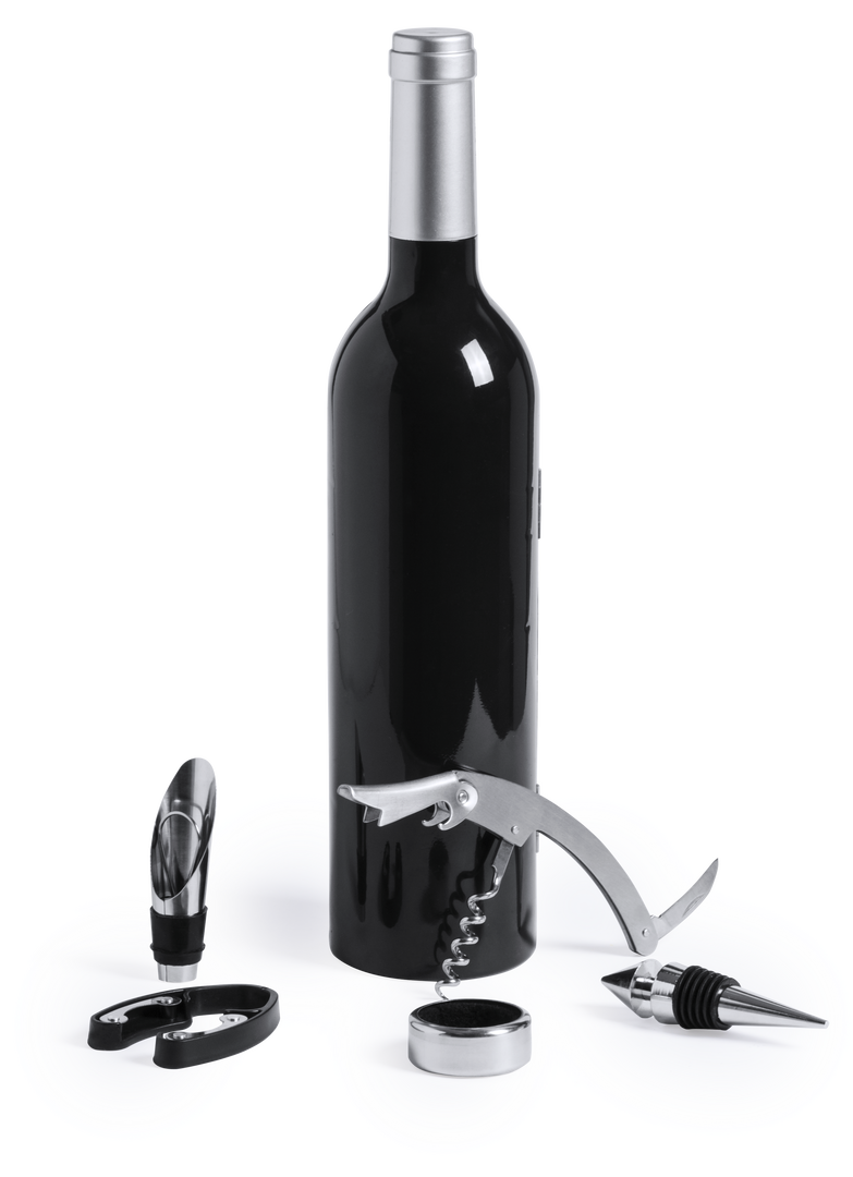 Original set de vinos en forma de botella de vino de acabado brillante, cierre magnético y accesorios de acero inox. Incluye sacacorchos con cortacápsulas y abridor, tapón dosificador y recogegotas. Presentado en estuche individual con interior en suave e 5 Accesorios