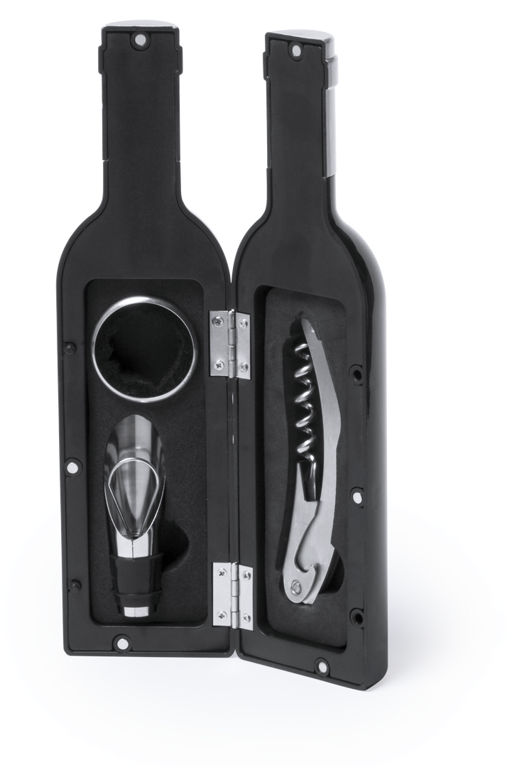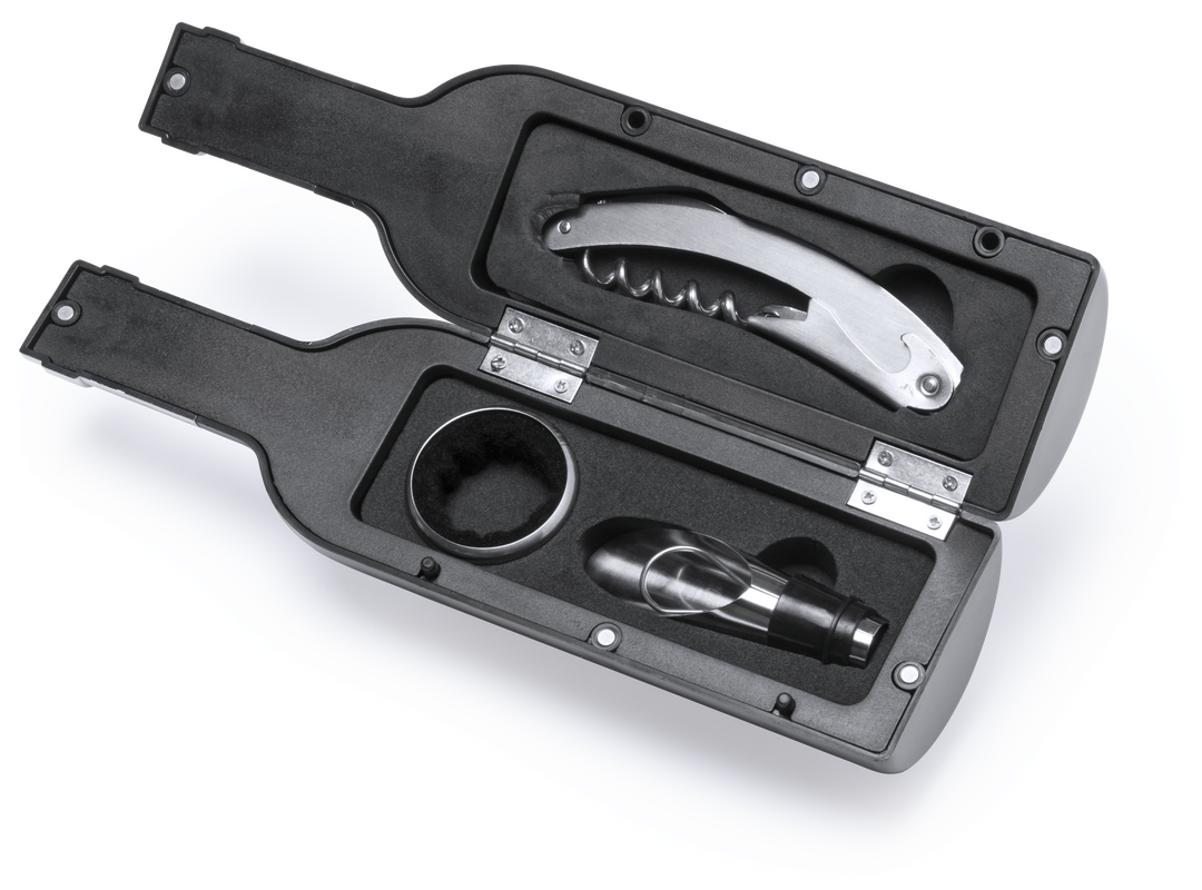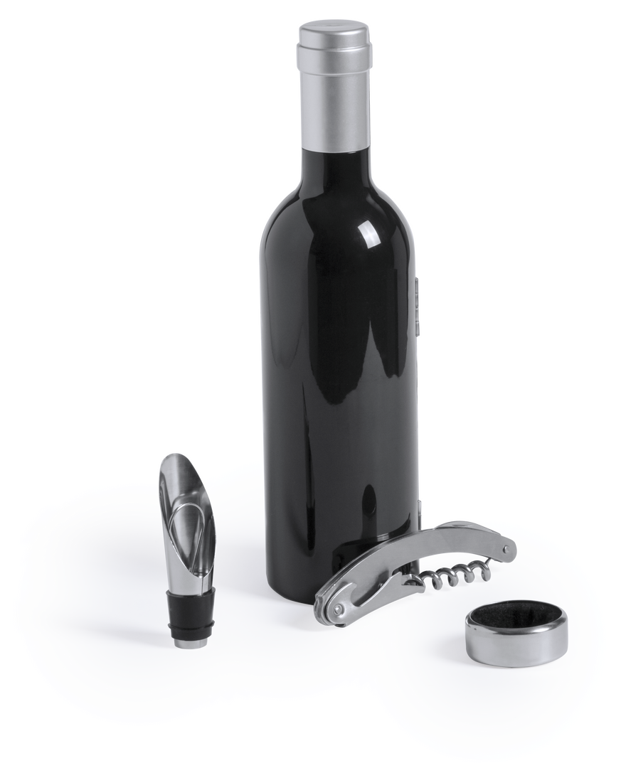 Original set de vinos en forma de botella de vino de acabado brillante, cierre magnético y accesorios de acero inox. Incluye sacacorchos con cortacápsulas y abridor, tapón dosificador, recogegotas, cortacápsulas y tapón. Presentado en estuche individual c 3 Accesorios