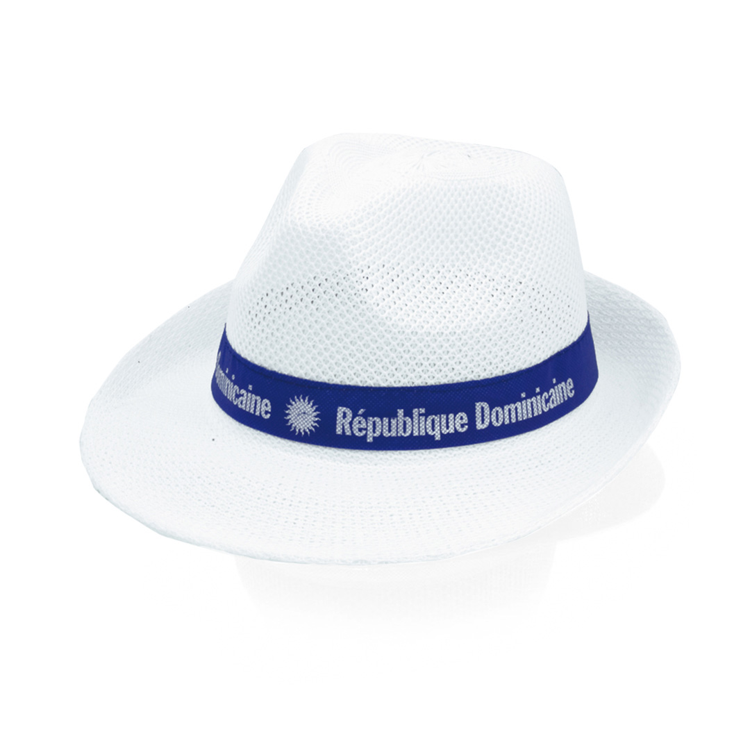 Sombrero de alta calidad en material sintético de sobrios colores con confortable cinta interior a juego.