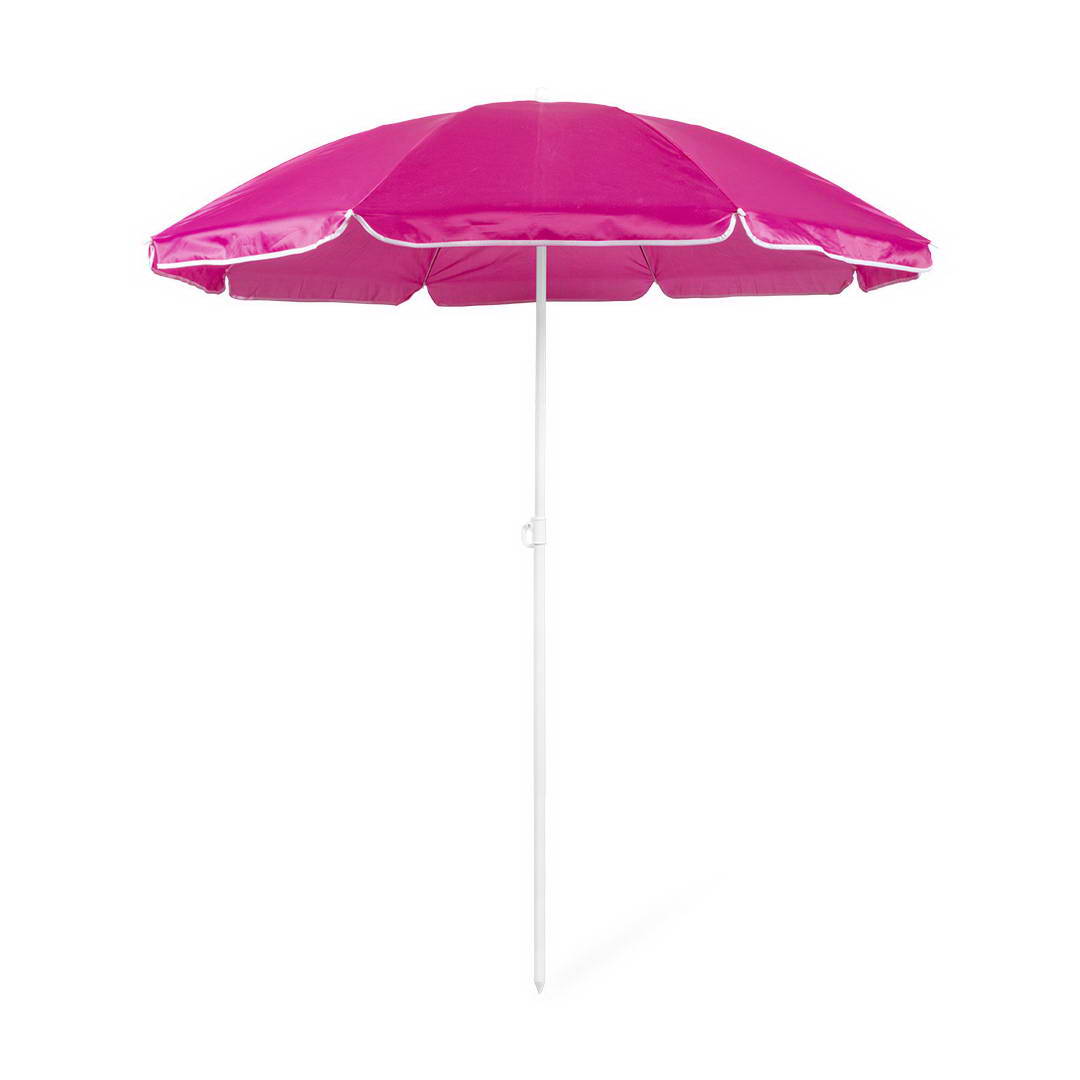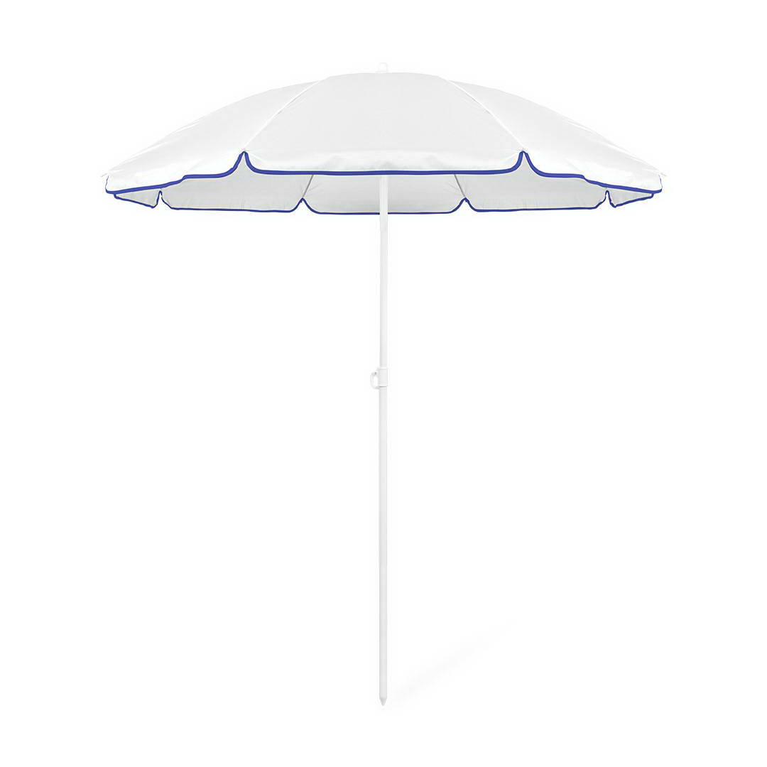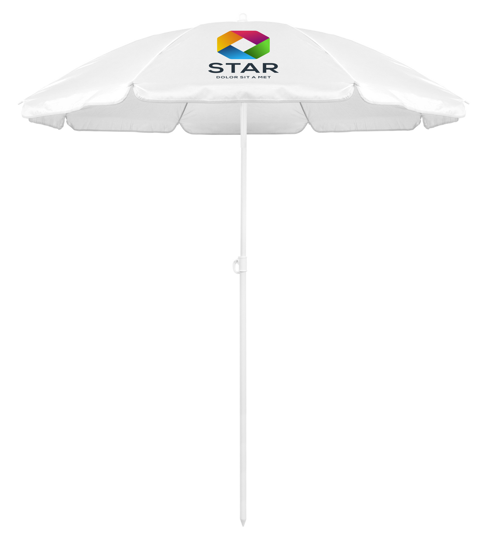 Sombrilla de playa de 8 paneles de resistente nylon en variada gama de vivos colores. De 150cm de diámetro, con faldones laterales ribeteados, tubos metalizados en color blanco y ajustable en altura. Presentada en funda de PVC con cinta de transporte para