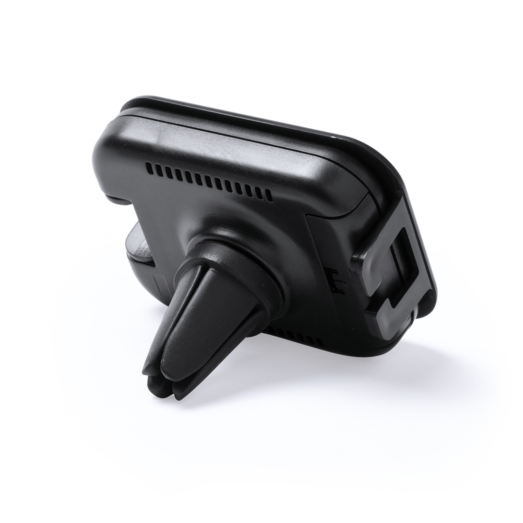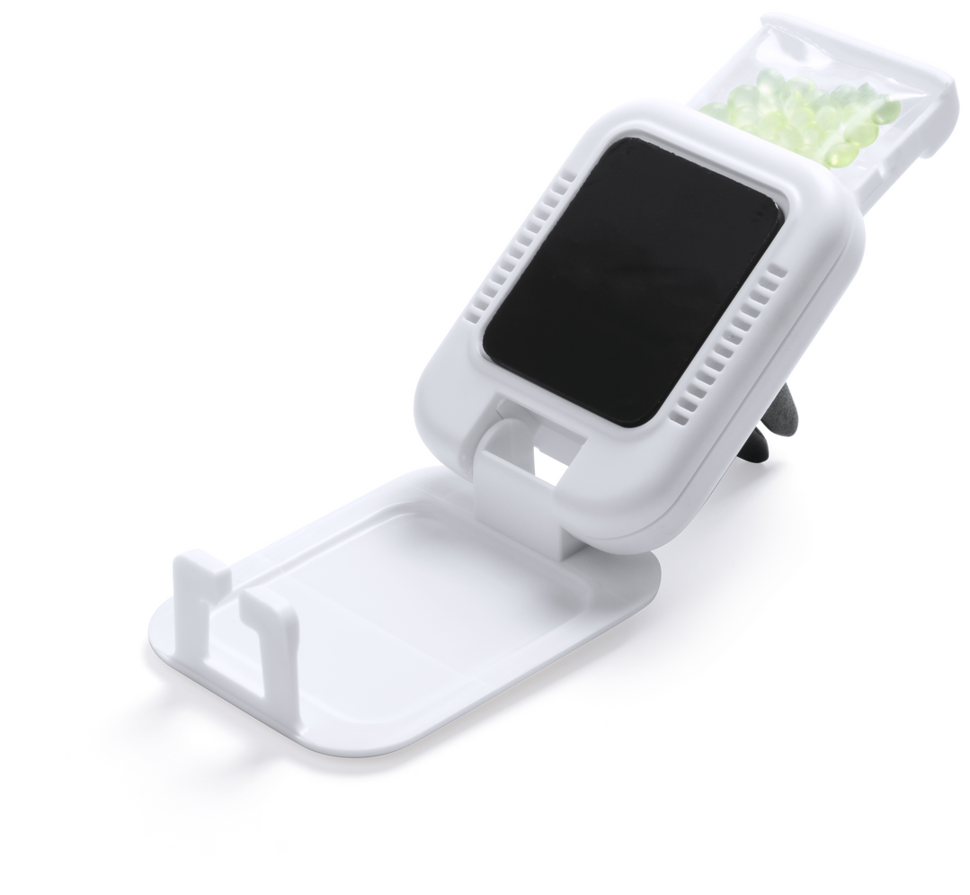Soporte plegable para smartphone con sistema de fijación para rejilla de ventilación del automóvil y ambientador aroma limón integrado. De acabado liso en color blanco y especialmente diseñado para impresión en tampografía. Aroma Limón. Superficie Adherente