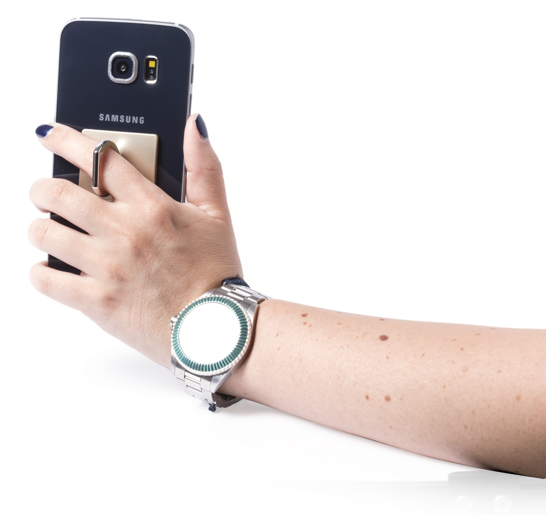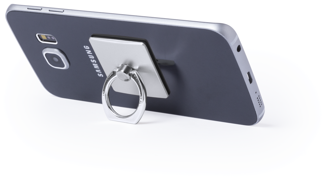 Soporte adhesivo para smartphone de diseño minimalista y elegante acabado en plateado y dorado. Con anilla posterior telescópica para dedo con función doble de soporte y accesorio para selfies. Adhesivo