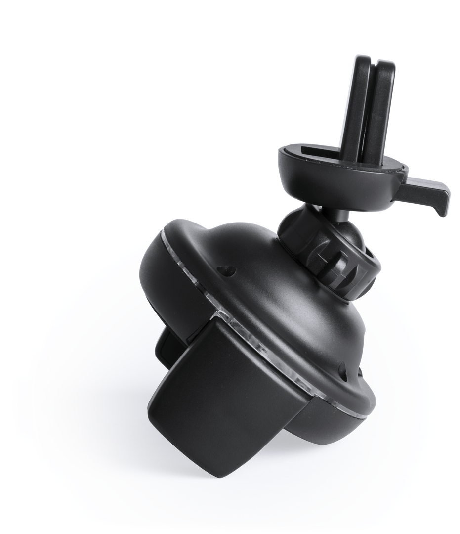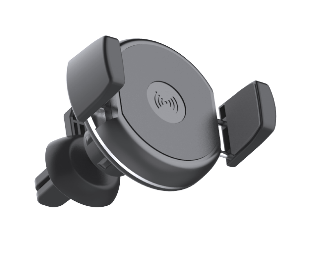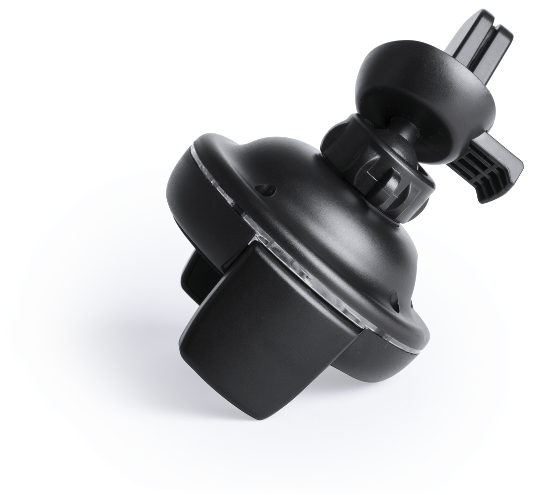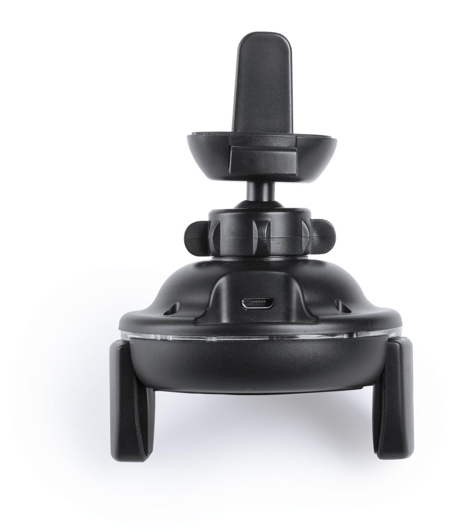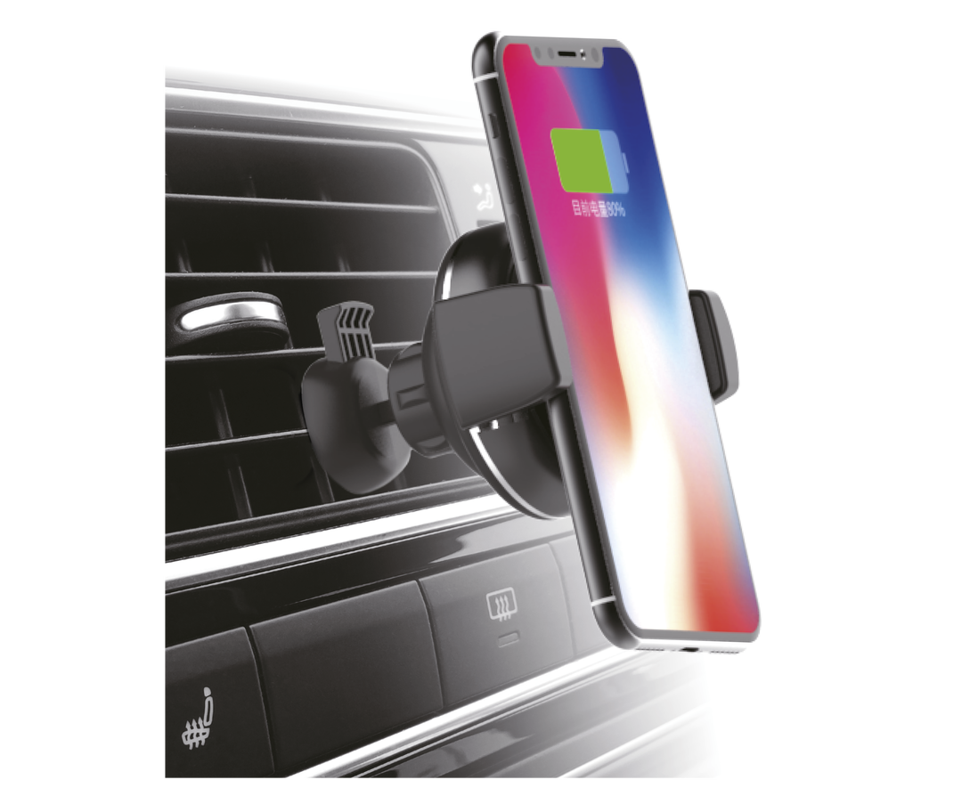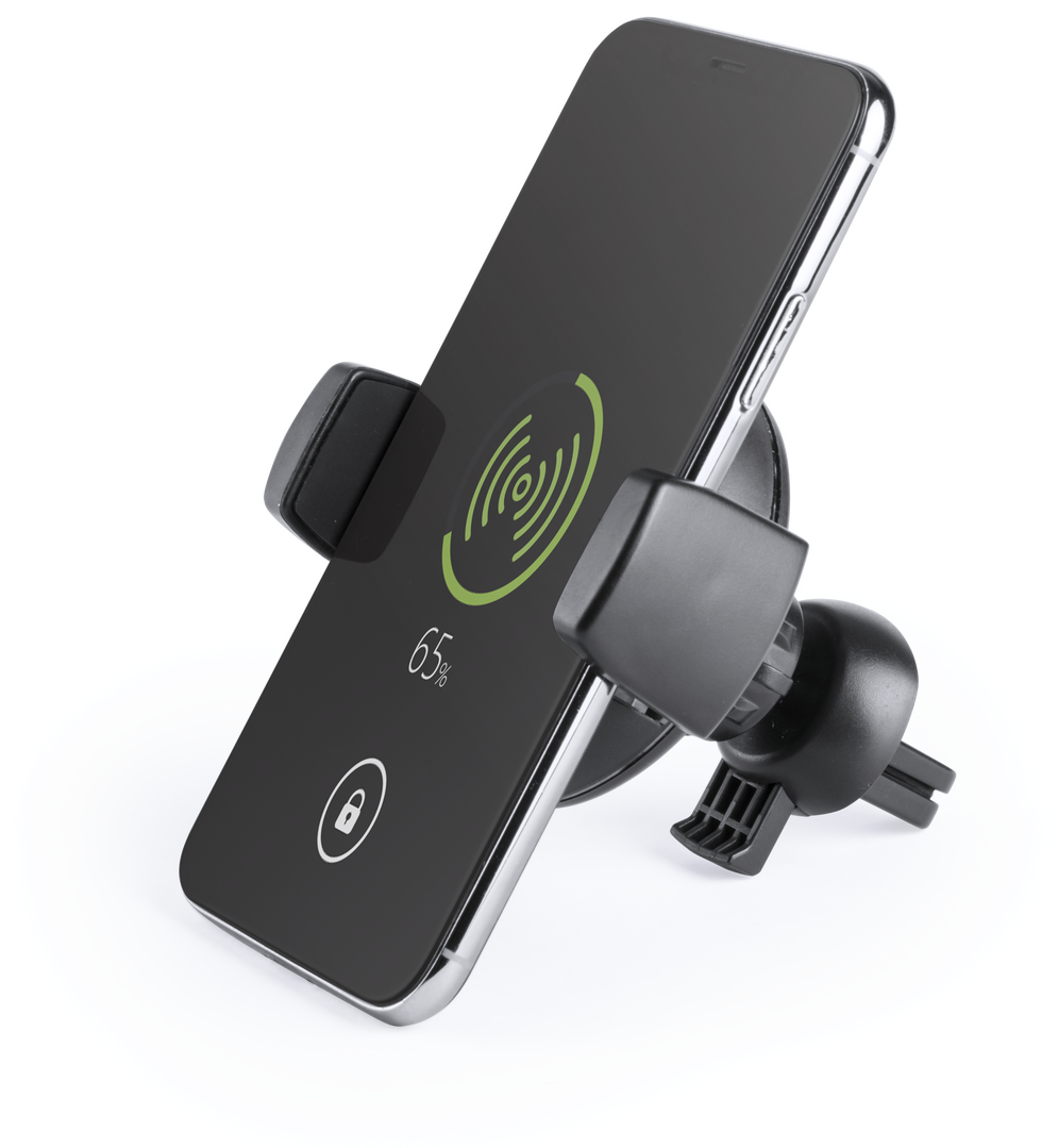 Soporte de rejilla de coche para smartphone con cargador inalámbrico integrado. En elegante color negro, con giro 360º y 45º de inclinación. Presentado en atractiva caja de diseño. Inalámbrico. Ajustable. Cable Incluido