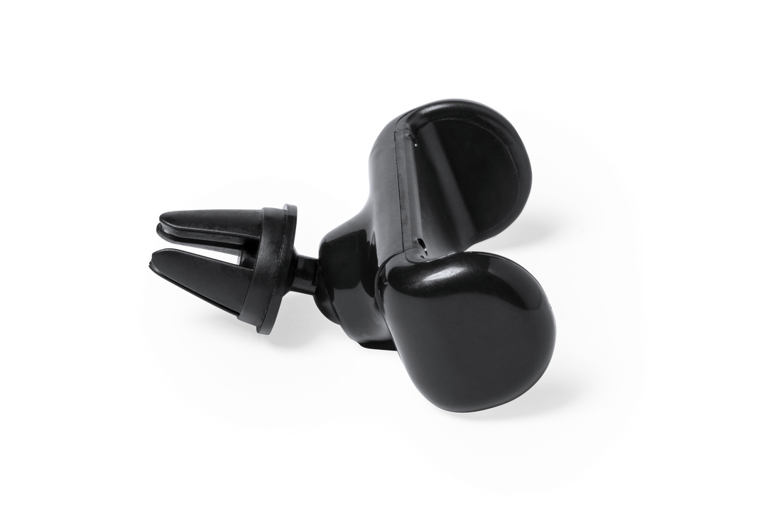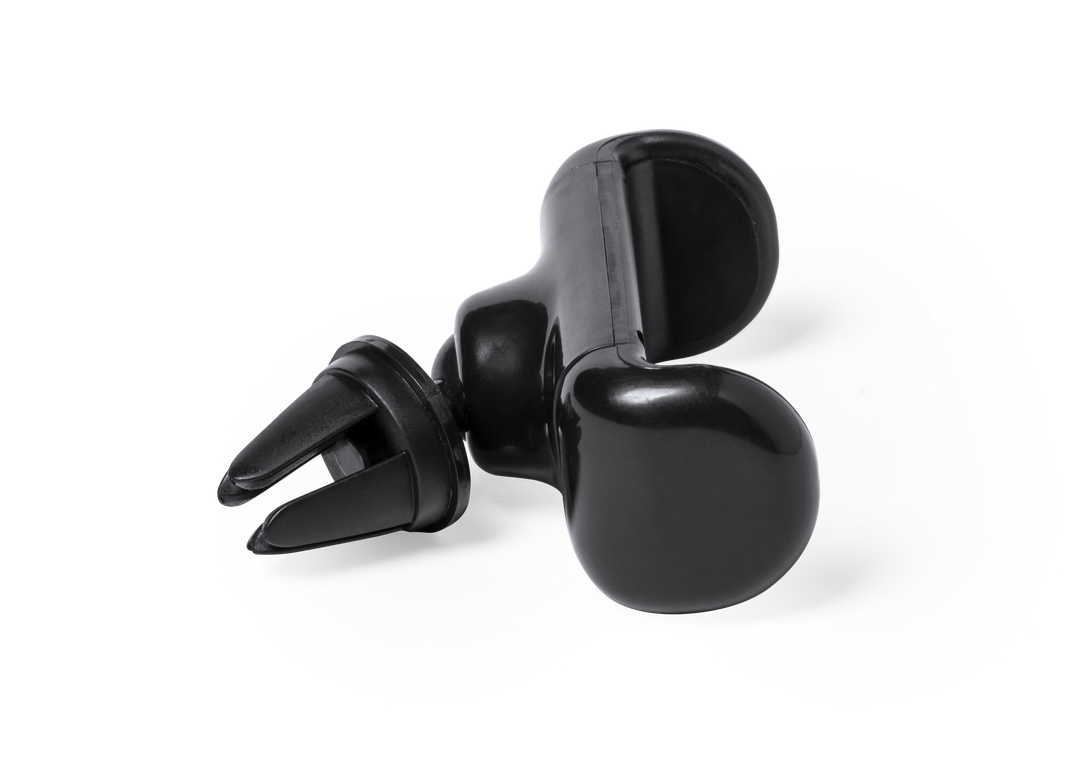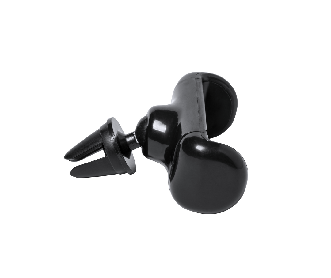 Soporte ajustable para smartphone de diseño minimalista, con base rotatoria 360º y de elegante acabado en color negro. Con sistema de fijación para rejilla de ventilación del automóvil y amplia superficie de marcaje, diseñado especialmente para tampografí Ajustable