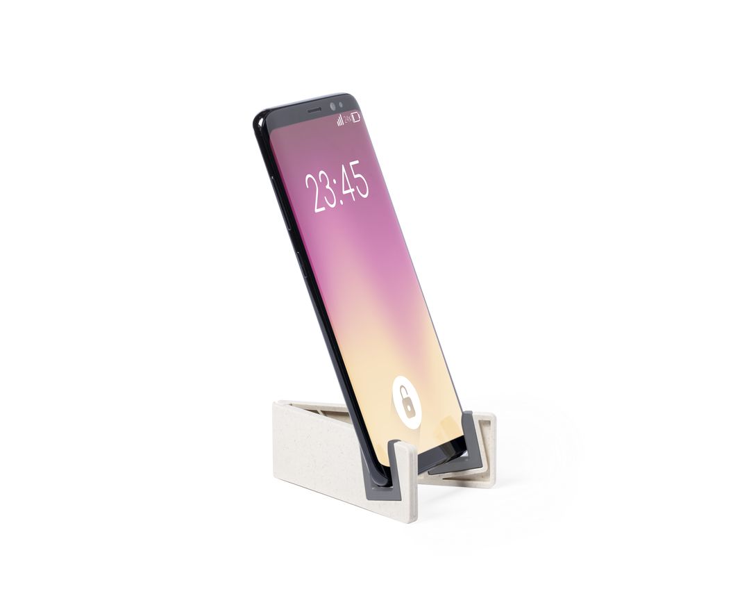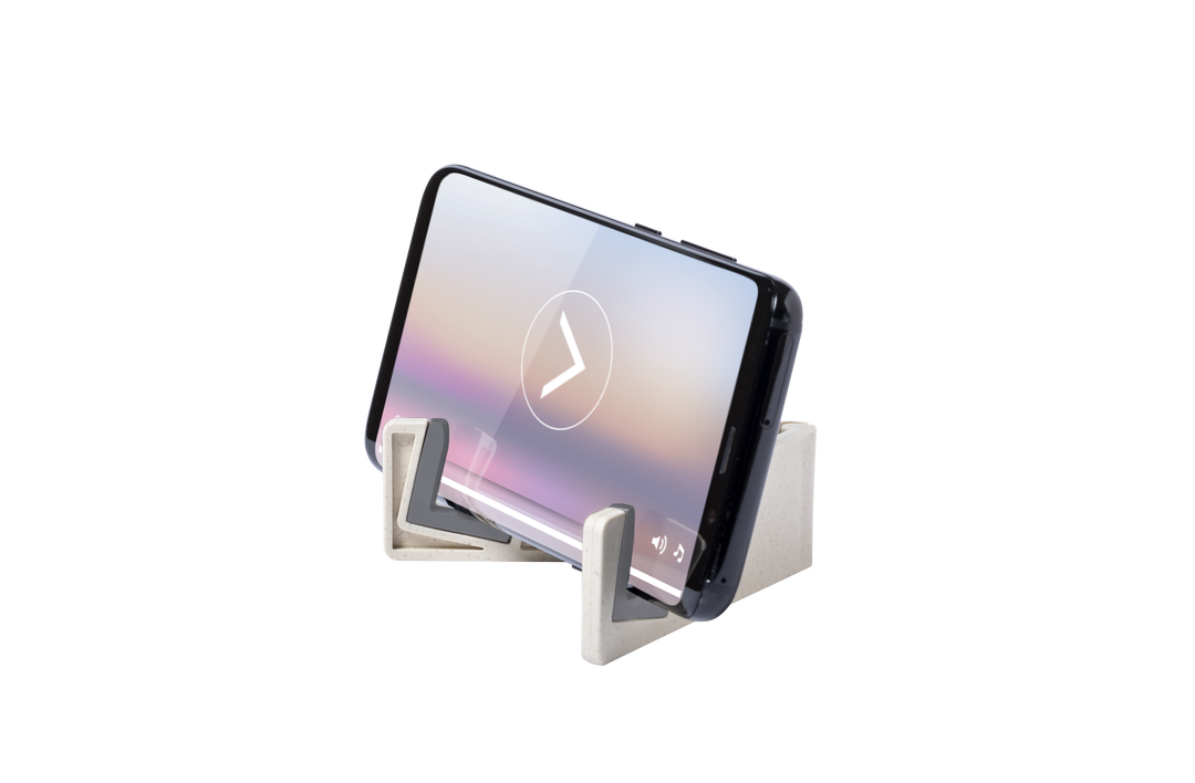 Soporte para dispositivo móvil de línea nature. Fabricado en caña de trigo/PP, para así fomentar la utilización de materias primas naturales y reducir las emisiones contaminantes. Patas plegables con topes antideslizantes en PVC, especialmente diseñado pa