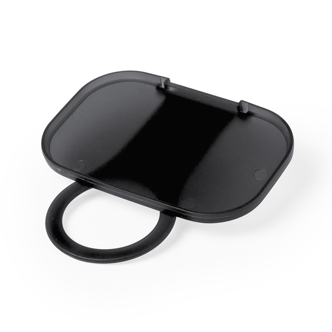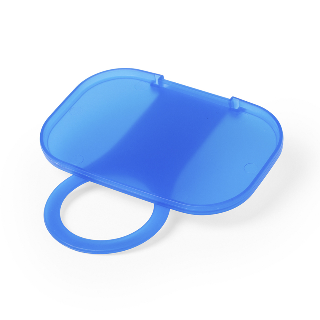 Original soporte plegable para acople en toma de corriente de pared. Cuerpo en acabado translúcido y especialmente diseñado para marcaje en tampografía.