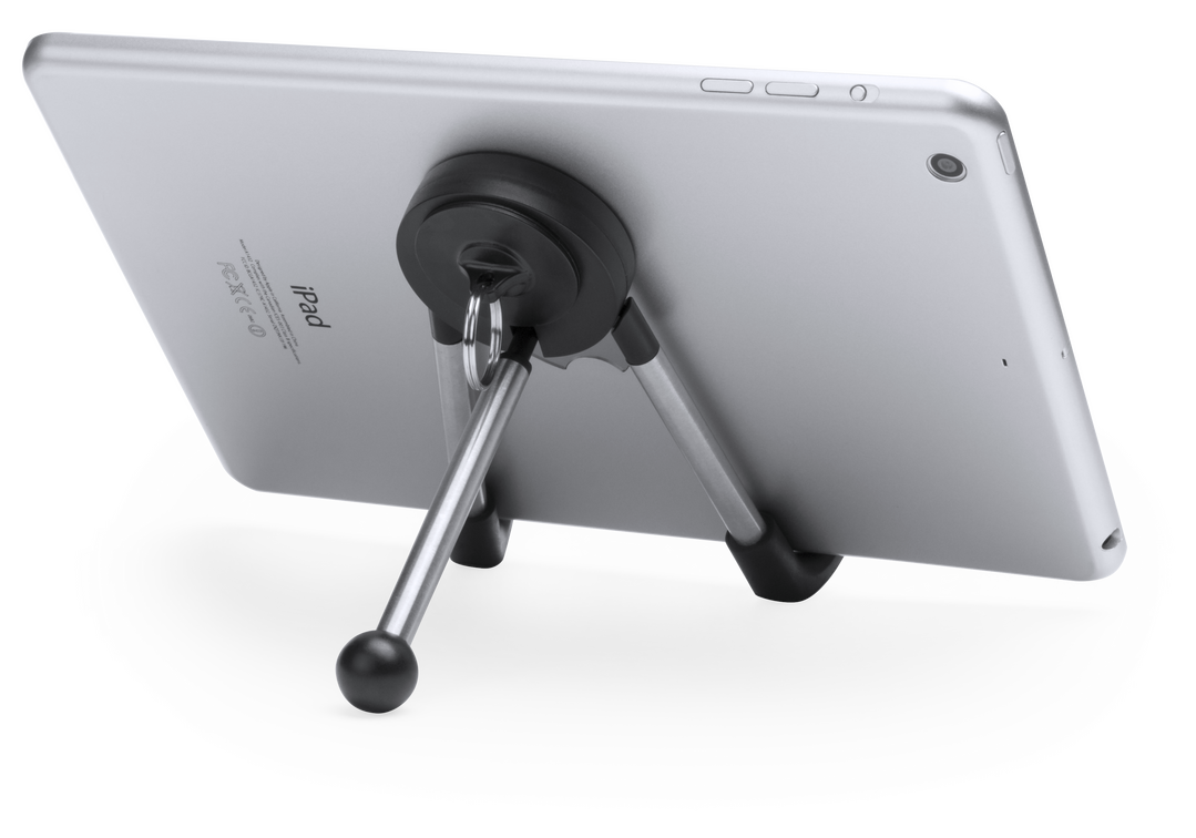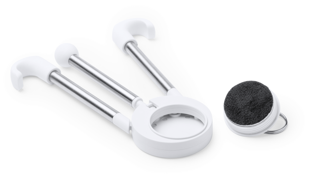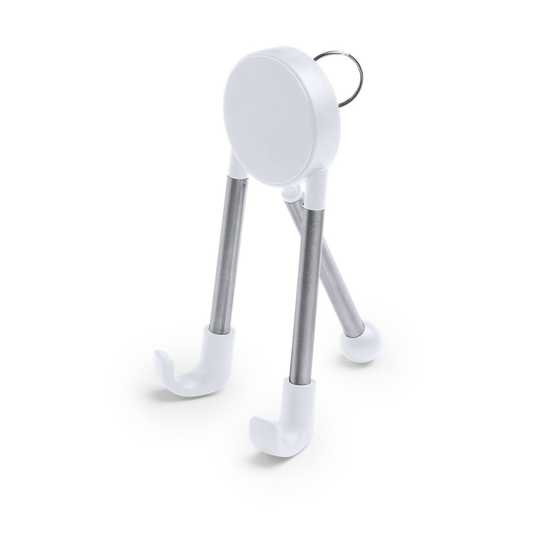 Original soporte telescópico para dispositivos móviles con sistema antideslizante, patas en acero inox y limpiador de pantalla integrado, accesible desenroscando la anilla de la parte trasera. Presentado en caja individual. Limpiapantallas Incluido