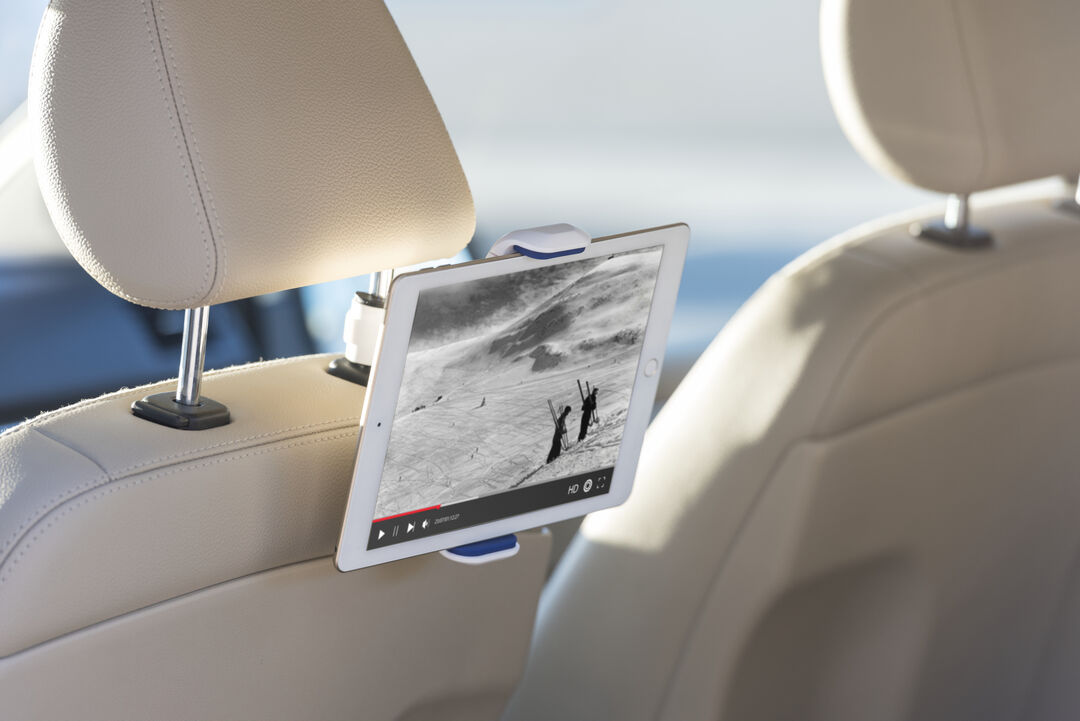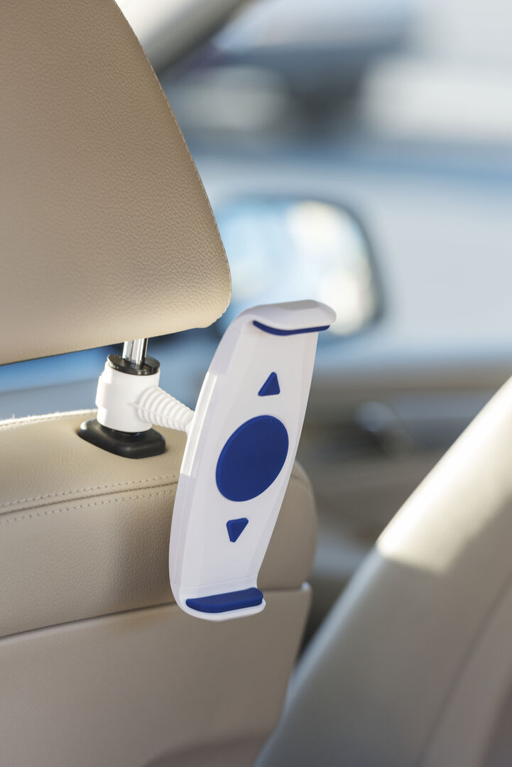 Original soporte para dispositivos móviles de hasta 10 pulgadas para acople a la barra del cabecero del coche. En variada gama de colores, giratorio 360º y con gomas anti deslizantes de alta sujeción. Ajustable