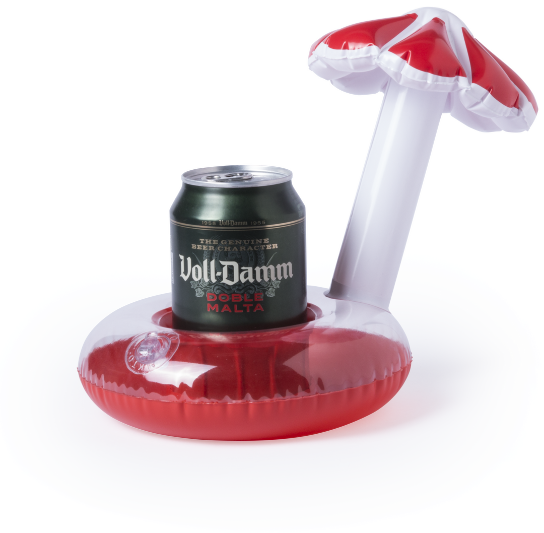 VerdeOriginal soporte inflable para bebida en forma de flotador con sombrilla de playa. Con suave cuerpo acabado en PVC de vivos colores y presentado con plegado especial para impresión. Plegado Especial para Impresión