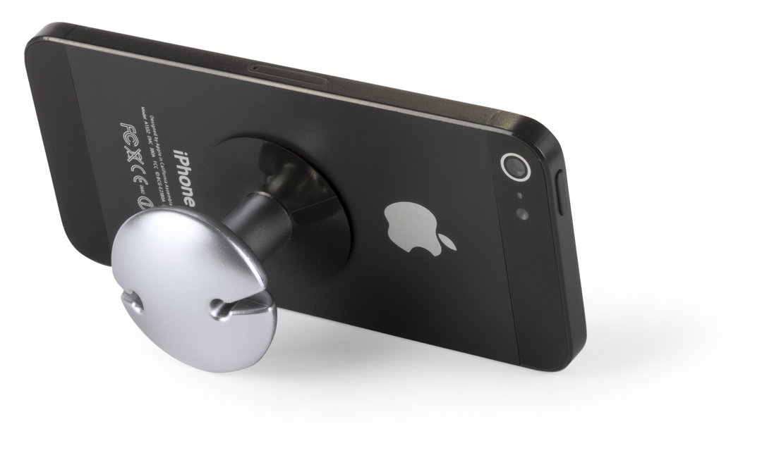 Soporte para smartphone con función de soporte para auriculares (no incluidos) y sistema de fijación mediante ventosa.