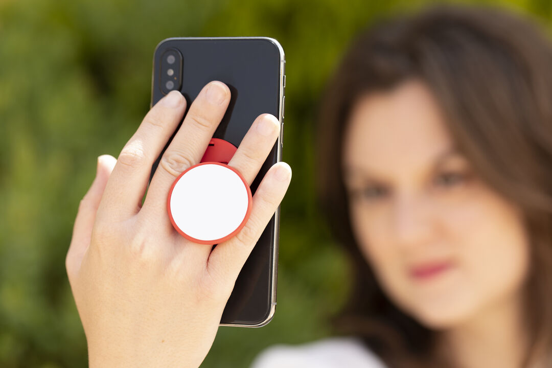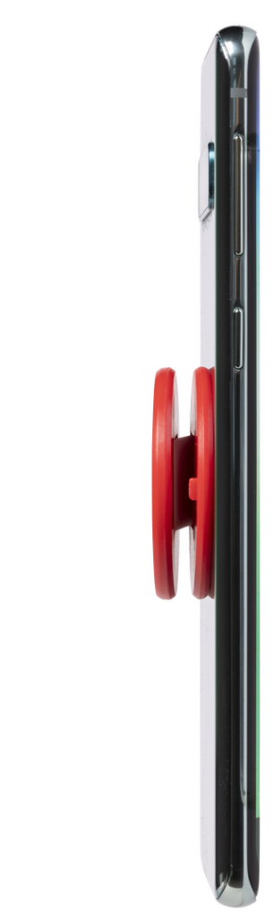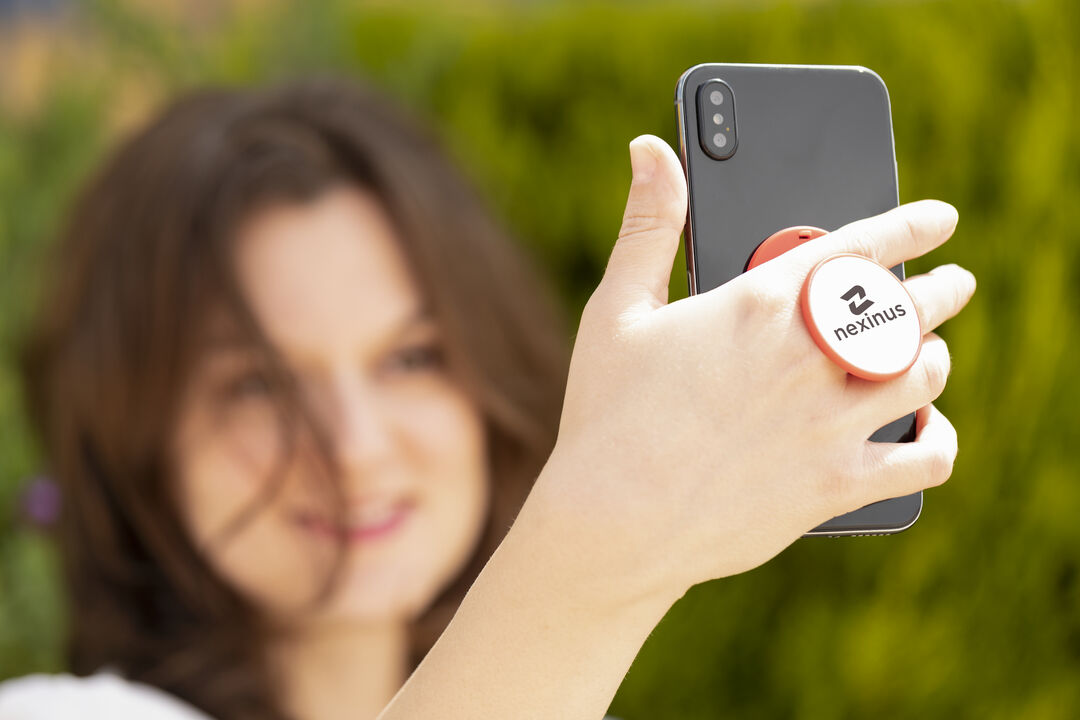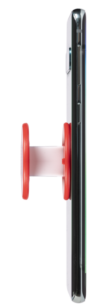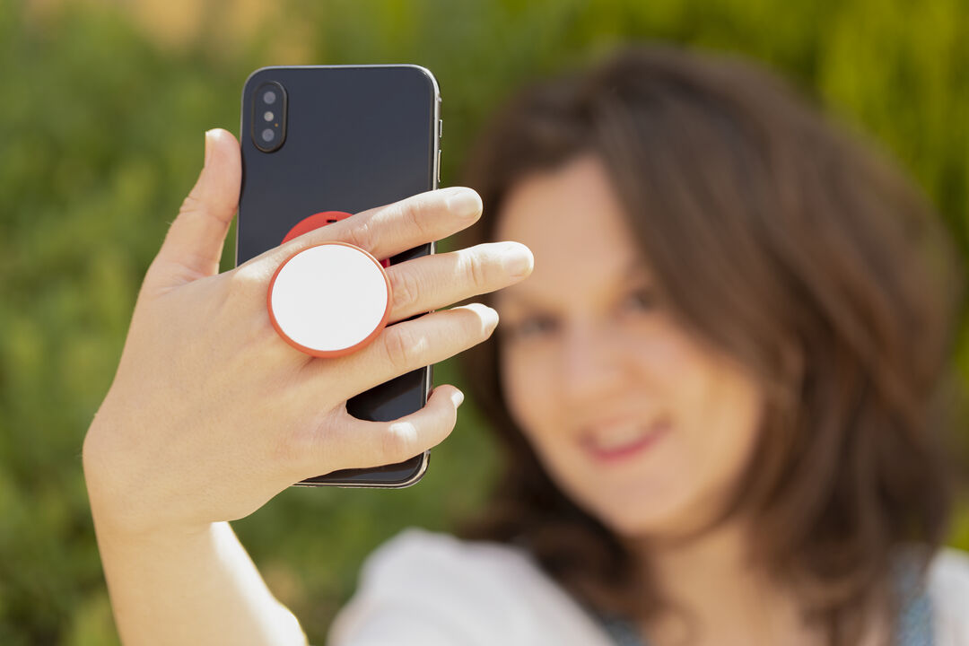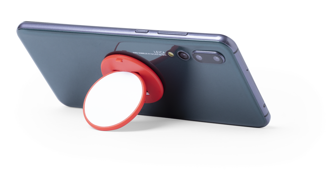 Soporte selfie en plástico ABS para smartphone. De llamativo diseño, disponible en extensa gama de colores y con adhesivo 3M, de fijación extra fuerte y libre de residuos al despegarlo del dispositivo. Con soporte posterior para los dedos. Adhesivo